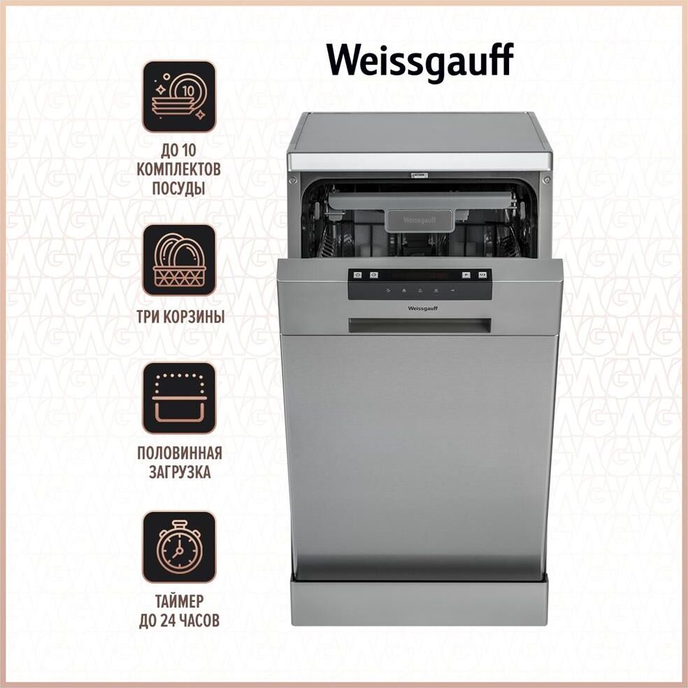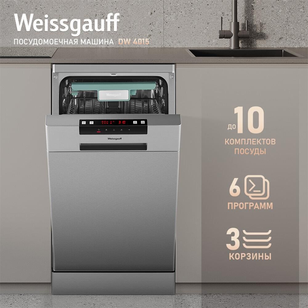 WEISSGAUFF Посудомоечная машина DW 4015, узкая, напольная, 44.8см, загрузка 10 комплектов, серебрист