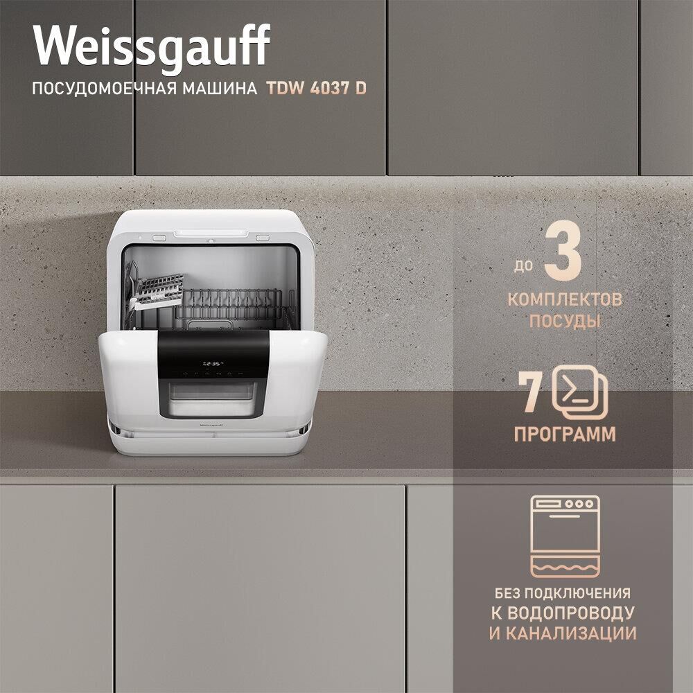 WEISSGAUFF Посудомоечная машина TDW 4037 D, компактная, настольная, 42см, загрузка 3 комплектов, бел