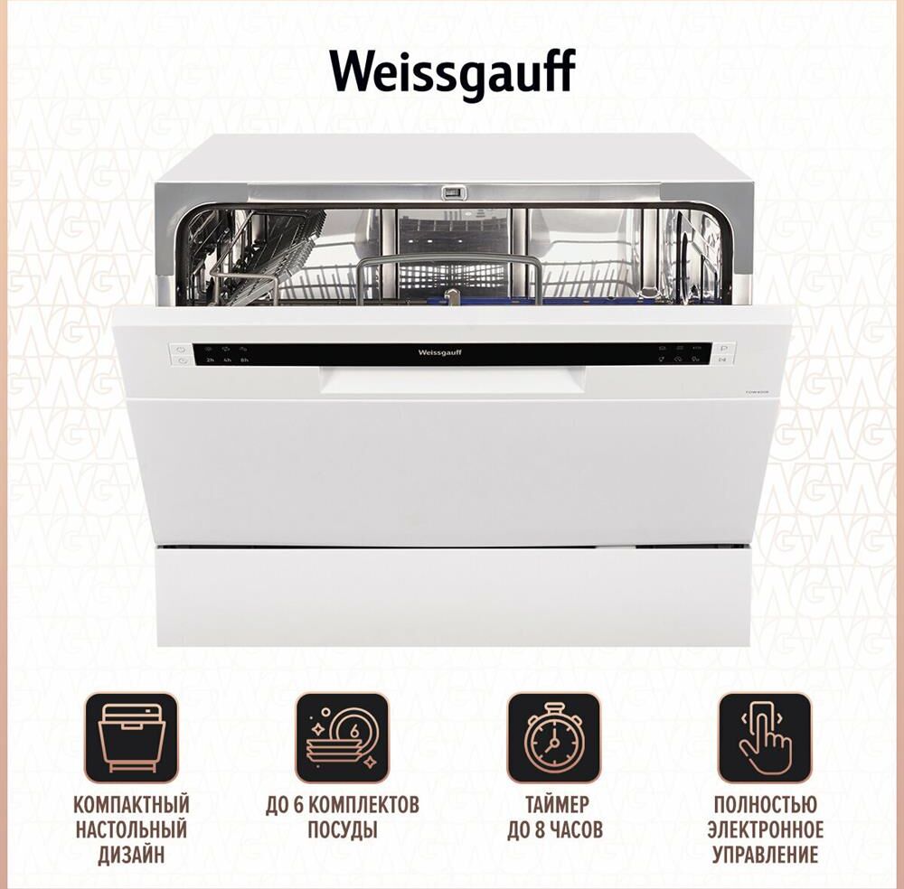 WEISSGAUFF Посудомоечная машина TDW 4006, компактная, настольная, 55см, загрузка 6 комплектов, белая