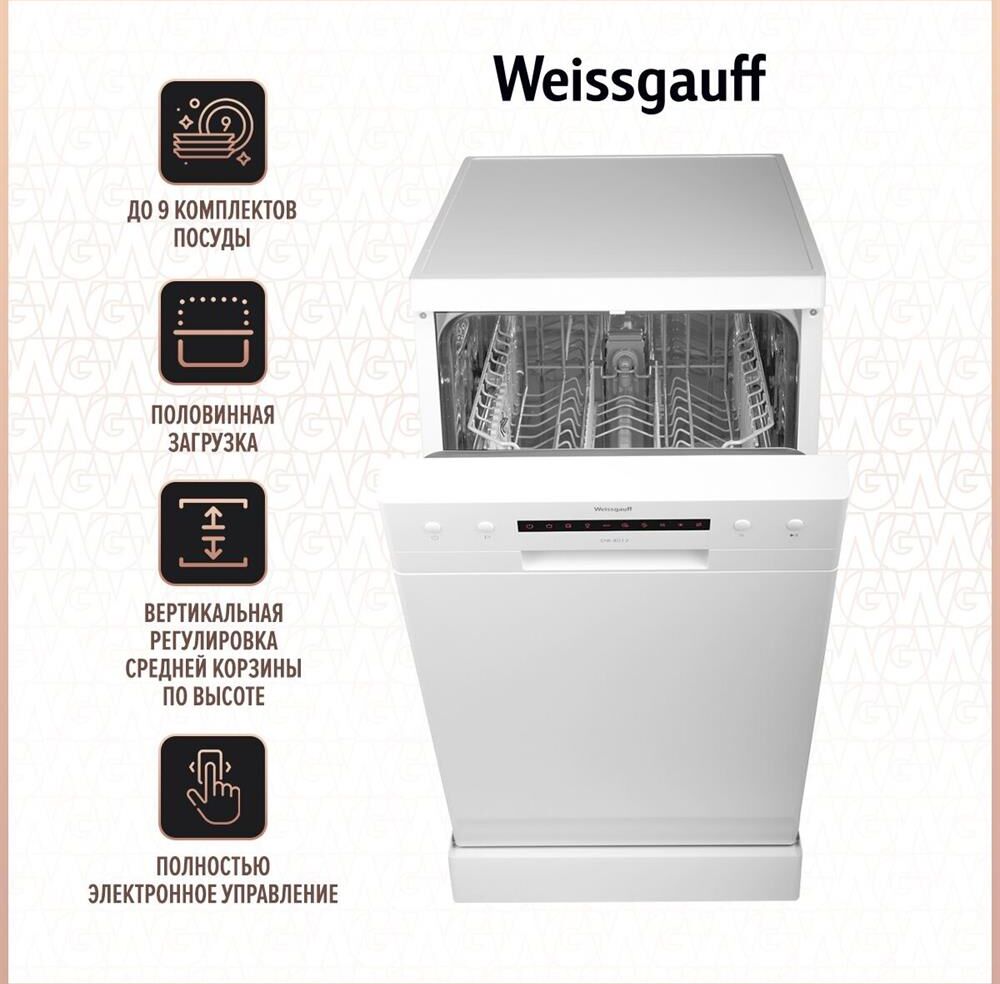 WEISSGAUFF Посудомоечная машина DW 4012, узкая, напольная, 44.8см, загрузка 9 комплектов, белая [424