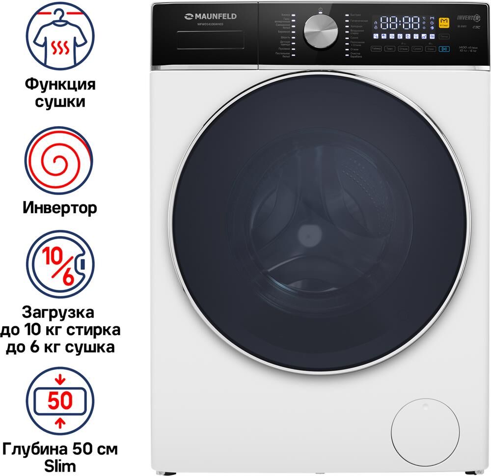 MAUNFELD Стиральная машина MFWD14106WH03, с фронтальной загрузкой, 10кг, 1400об/мин, с сушкой, инвер