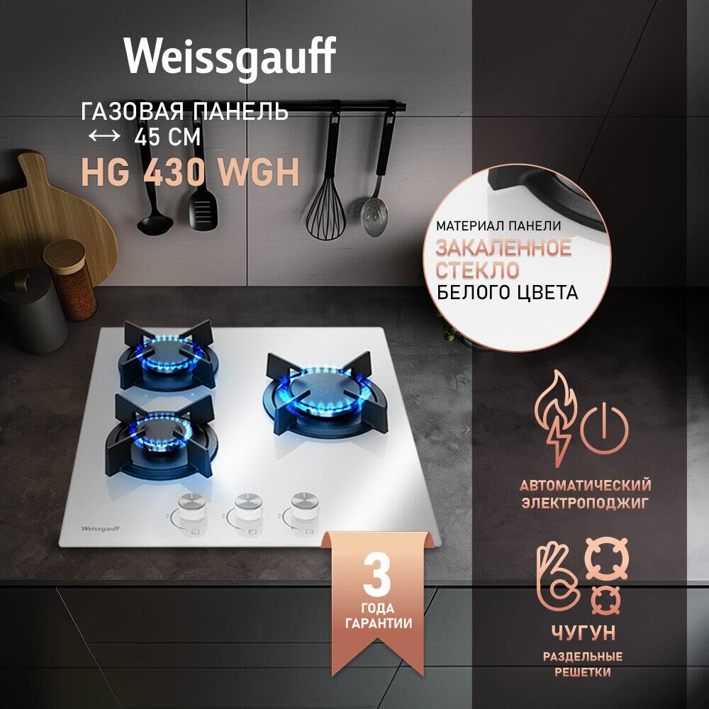 WEISSGAUFF Газовая варочная панель HG 430 WGH, 3 конфорки, закаленное стекло, белый