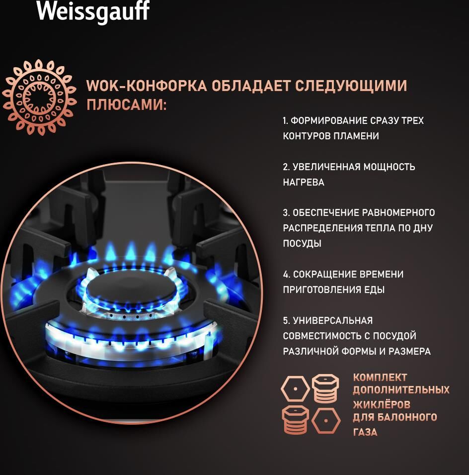 WEISSGAUFF Газовая варочная панель HG 640 BGV, 4 конфорки, закаленное стекло, черный