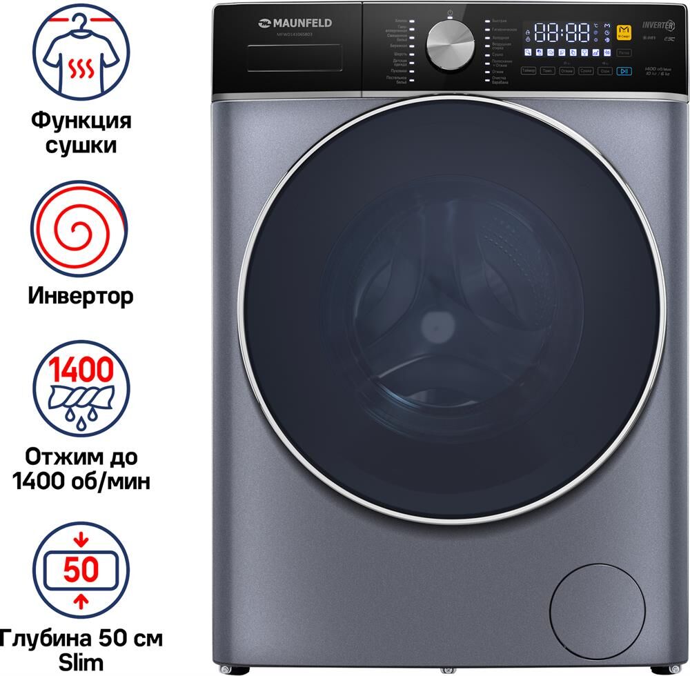 MAUNFELD Стиральная машина MFWD14106SB03, с фронтальной загрузкой, 10кг, 1400об/мин, с сушкой, инвер