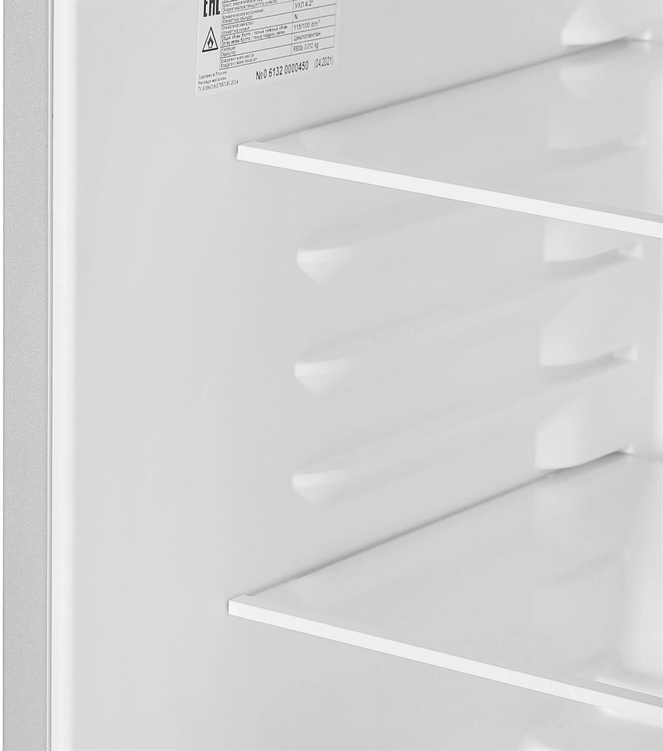 Габариты ВхШхГ: 86.5х48х60.5см; Цвет: Металлик; Управление: Механическое; Общий объем, л: 115; Общий полезный объем: 100 л; Количество камер: 1; Оттаивание холодильной камеры: автоматическое; Количество компрессоров: 1; Суточный расход электроэнергии, при температуре окружающего воздуха 24°C, кВтч: 0.47; Климатический класс: N; Класс энергоэффективности: A; Максимальный уровень шума, дБ: 40; Количество полок в холодильном отделении: 3; Температура в отделении для хранения свежих пищевых продуктов: От 0 до 8 °C; Материал полок: стекло/пластик; Оттаивание холодильной камеры: автоматическое; Количество ящиков в холодильном отделении: 1; Освещение: LED