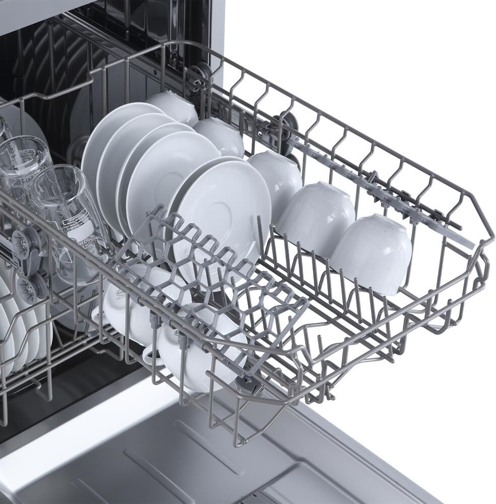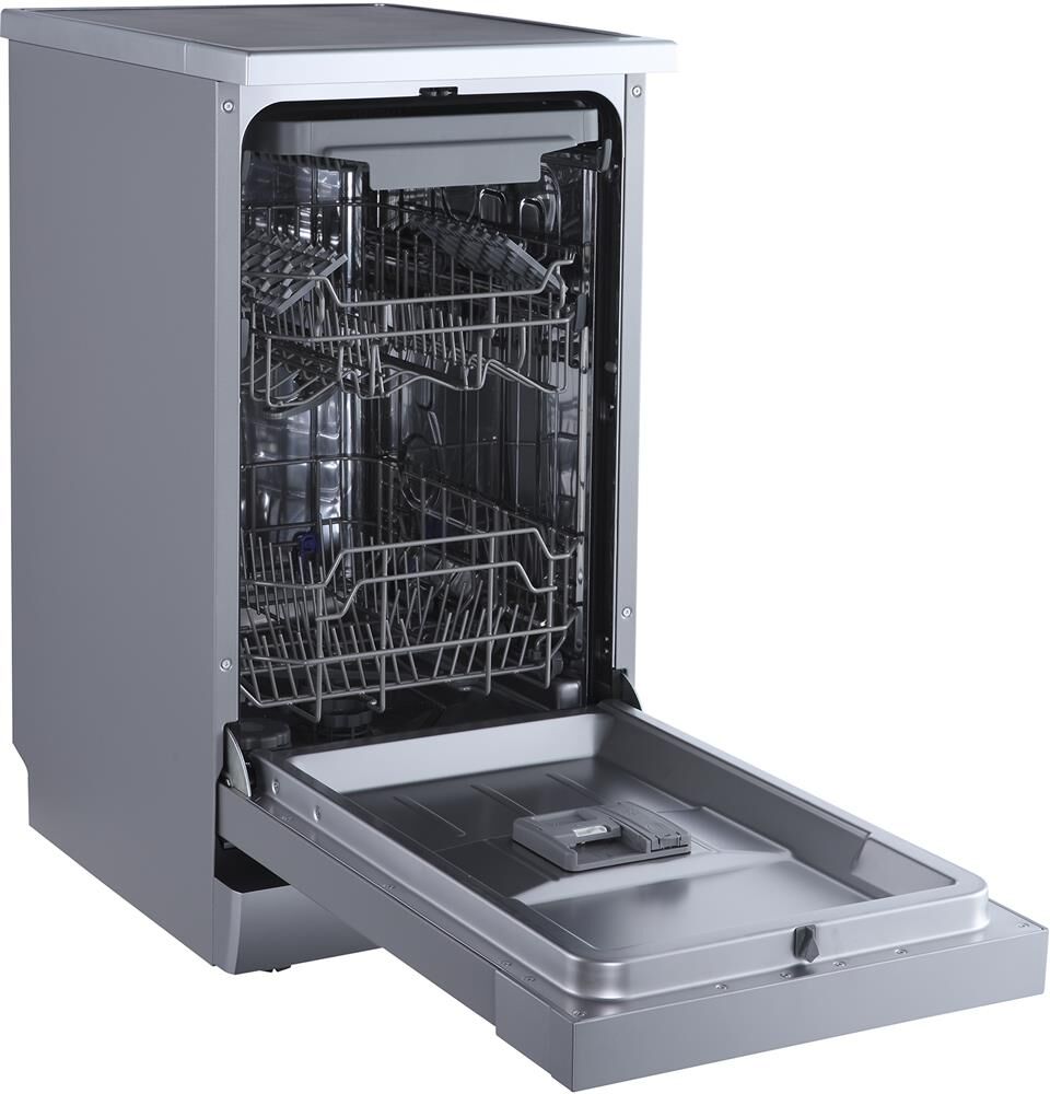 Отдельностоящая, габариты 84,5×44,8×60 см, Цвет металлик, 10 комплектов посуды, кол-во корзин — 2 для посуды, 1 для столовых приборов, А++, LED дисплей, таймер отсрочки запуска 1-24 ч, кол-во программ — 6: интенсивная, обычная, эко, быстрая, стекло, 90 минут, тип сушки — конденсационная, расход воды за цикл — 9л., режим 1/2 загрузки, экстра сушка, макс.уровень шума — 49 дБ