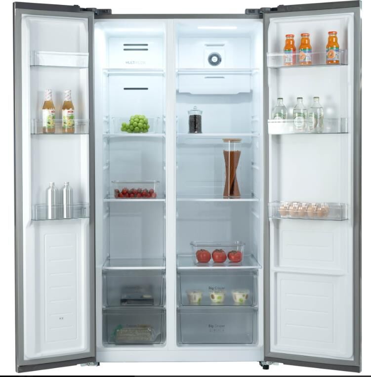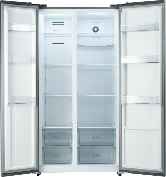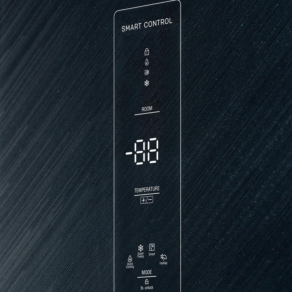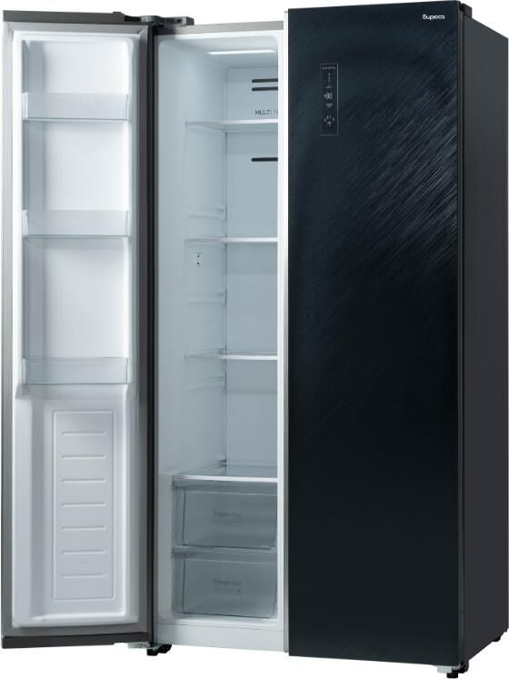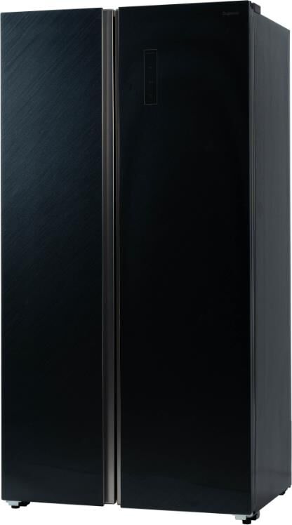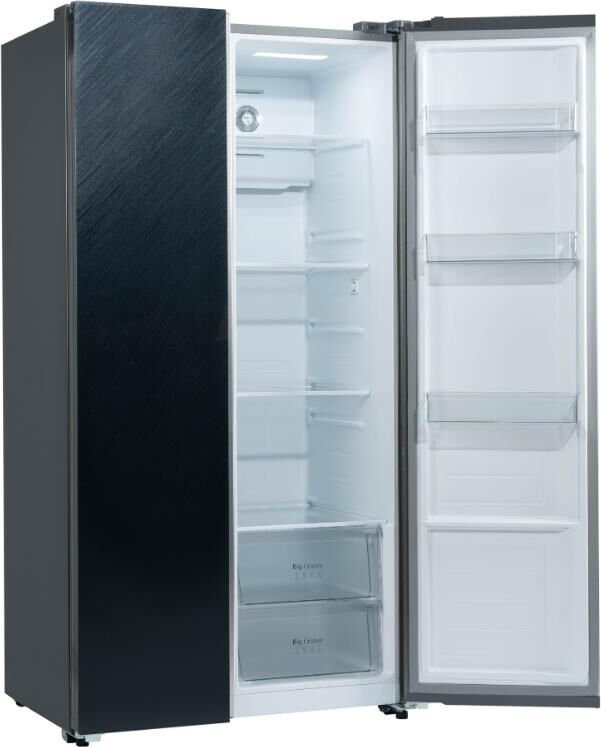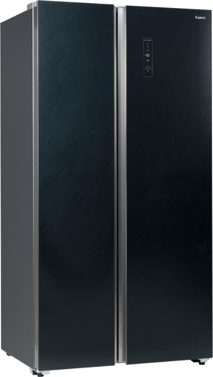 Холодильник Side-by-side с текстурированным черным стеклом • система Full No Frost • Dual Inverter: инверторные компрессор и вентилятор • дисплей на двери • система распределения воздушных потоков MultiFlow • класс энергоэффективности А++ • деодорирующий фильтр Nano Ag+ • габариты 178,5×91,3×67см • объем 541/343/198л