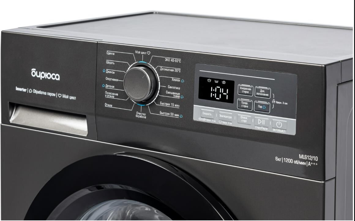 Габариты ВхШхГ, см: 85х59,5х46,5; Цвет: Темный металлик; Тип загрузки: Фронтальная; Загрузка: 6 кг; Объем барабана, л: 45.5; Тип двигателя: Инверторный; Тип управления: LED дисплей; Диаметр люка: 28.8; Расход воды за цикл: 43 л; Уровень шума в режиме Стирка: 59 дБ; Уровень шума в режиме Отжима: 79 дБ; Выбор температуры стирки; Обработка паром; Защита от детей; Контроль дисбаланса; Самоочистка барабана; Таймер отсрочки запуска; Автовзвешивание; Контроль пенообразования; Количество программ: 16; Максимальная скорость отжима 1200 об/мин