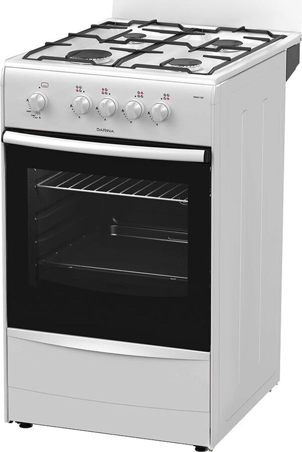 (ШхГхВ) 50x56x85 см.Цвет белый.Варочная панель газовая.Газ-контроль духовки.Очистка традиционная.Раб. поверхность эмаль.Количество конфорок 4,быстрого разогрева 1.Обьем духовки 50 л.Дверца откидная.Ящик для посуды.