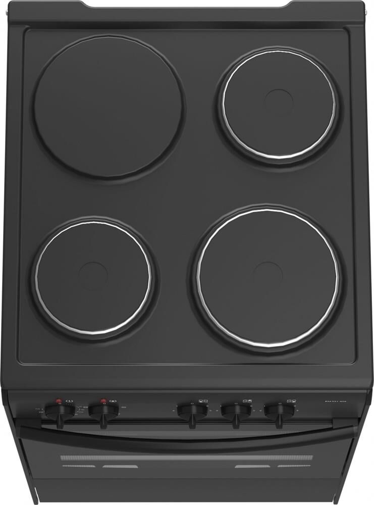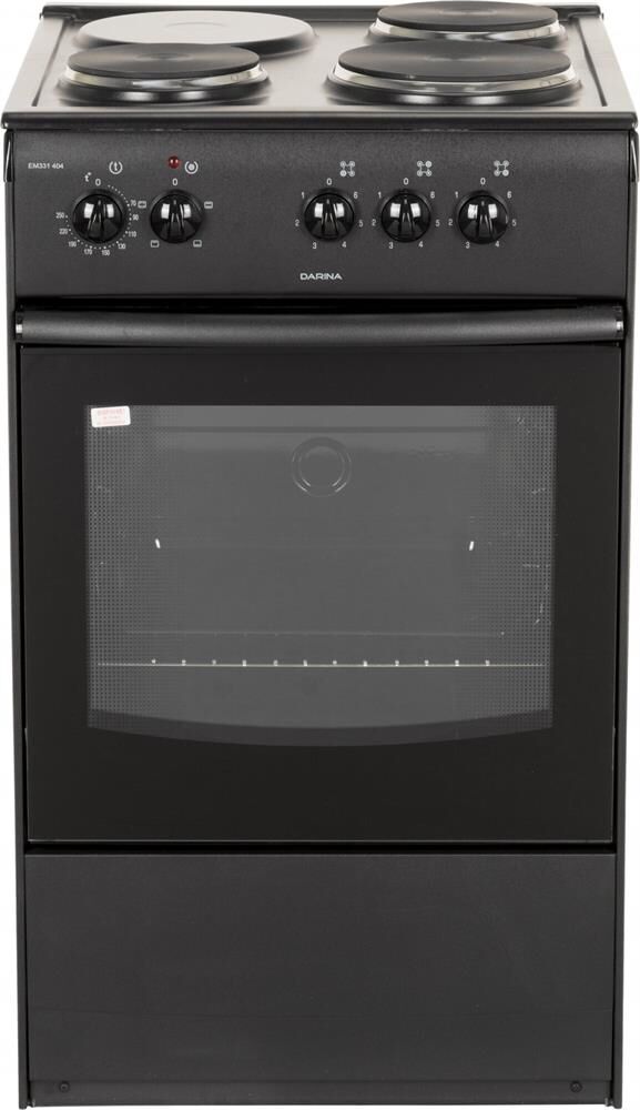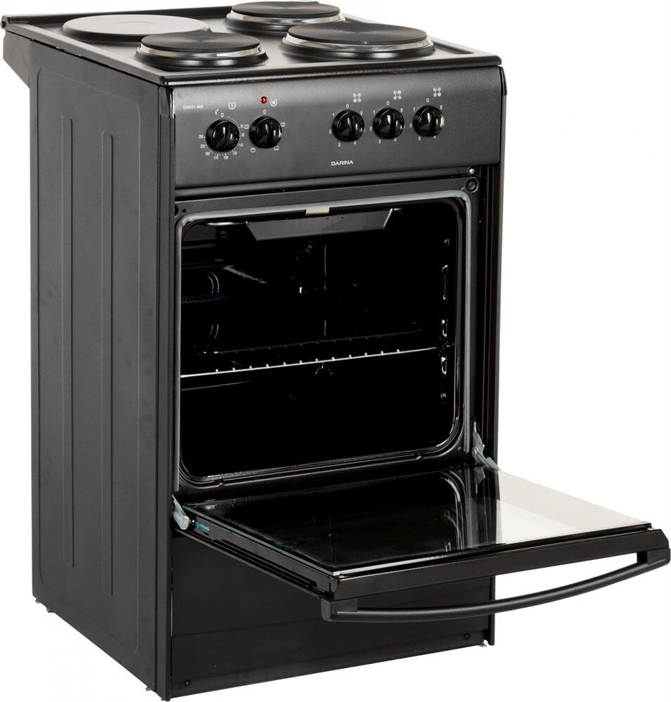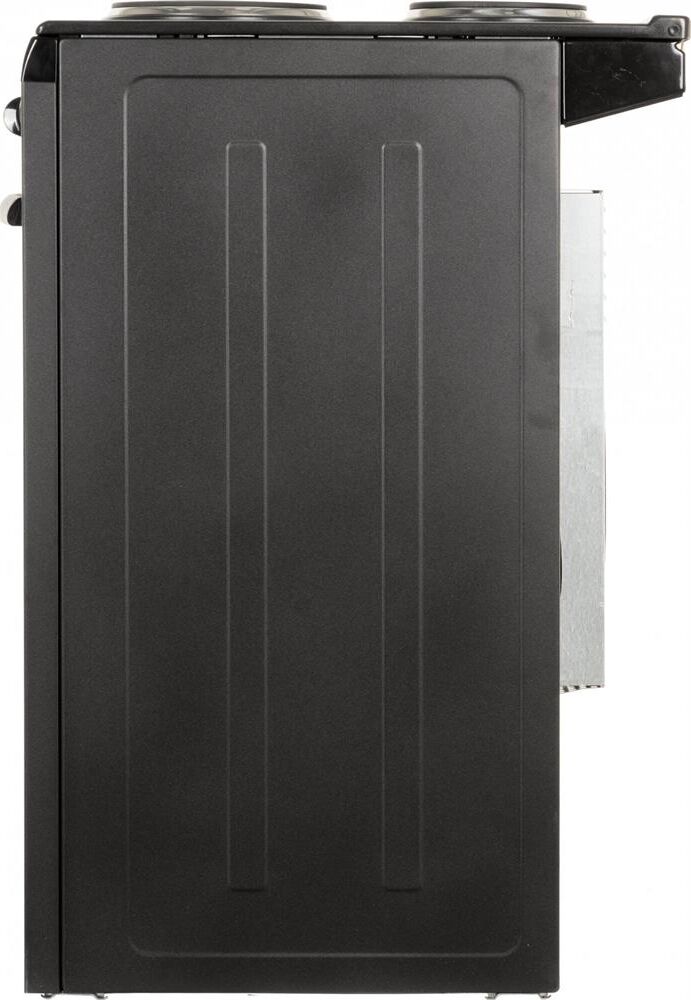(ШxГxВ) 50x56x85 см.Цвет чёрный.Управление механическое, переключатели: поворотные.Духовка, варочная панель электрическая.Кол-во конфорок электрич.: 3.Объем духовки 47 л.Раб. поверхность эмаль.Дверца откидная, очистка традиционная.Кол-во стекол дверцы духовки два.