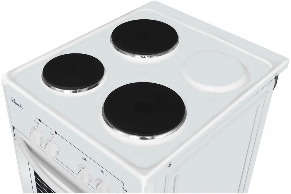 (ШхГхВ) 500х600х840±5 мм.Цвет белый.Установленная мощность: 6 кВт Масса нетто: 32 кг Количество конфорок: 3 Мощность передней левой конфорки: 1 кВт (145 мм) Мощность передней правой конфорки: 1.5 кВт (180 мм) Мощность задней левой конфорки: 1.5 кВт (180 мм) Тип духовки: электрическая Мощность вехнего ТЭНа: 0.8 кВт Мощность нижнего ТЭНа: 1.2 кВт Температура жарочного шкафа регулируется от 50 до 300 °С Объём жарочного шкафа — 57 л Дверца съёмная с двойным стеклом