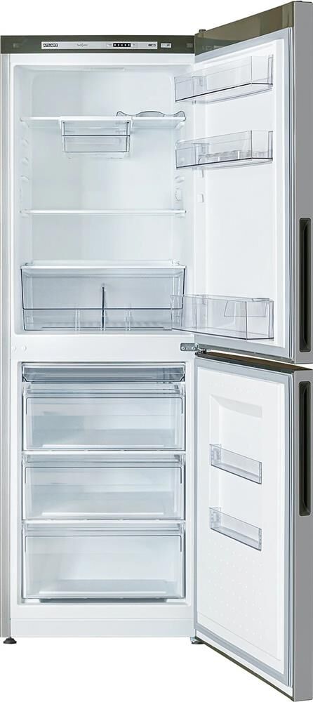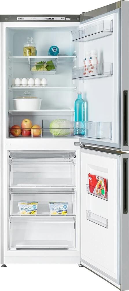 Двухкамерный холодильник. Габариты Ш/В/Г 595/1768/629 мм. Цвет корпуса серебристый. Класс энергоэффективности A+. Количество компрессоров 1 шт. Уровень шума 39 дБА. Климатический класс N, ST. Перенавешиваемые двери. Внутреннее LED освещение. Электронный блок управления и индикации. Тип ручки скрытая. Номинальная потребляемая мощность 120 Вт. Количество камер 2 шт. Полный полезный объeм 301 л. Общий объем 315 л. Полезный объем холодильной камеры 182 л. Полезный объем морозильной камеры 119 л. Температура хранения свежих продуктов, до 8 °C. Средняя температура хранения свежих продуктов 4 °C. Автоматическая система оттаивания холодильной камеры. Номинальное время повышения температуры продуктов от -18 °C до -9 °C при отключении электроэнергии 20 ч. Температура хранения замороженных продуктов в морозильной камере -18 °C. Мощность замораживания при температуре окр. среды +25°С. 5.5 кг/сутки. Функция быстрого замораживания.