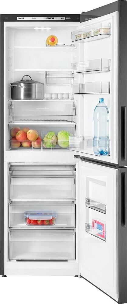 Двухкамерный с нижней морозильной камерой. Габариты Ш/Г/В 595/629/1868мм. Общий объём 338л. Вес 69 кг. Система охлаждения без NO FROST. Цвет корпуса черный металлик. Класс энергоэффективности А+. Уровень шума 39 дБА. Климатический класс N, ST. Внутреннее LED освещение. Электронный блок управления и индикации. Тип ручки скрытая. Полный полезный объем 324л. Полезный объем холодильной камеры 205 л. Полезный объем морозильной камеры 119 л. Самодиагностика. Температура хранения свежих продуктов, до 8 °C. Средняя температура хранения свежих продуктов 4 °C. Номинальное время повышения температуры продуктов от -18 °C до -9 °C при отключении электроэнергии 20 ч. Температура хранения замороженных продуктов в морозильной камере -18 °C. Мощность замораживания при температуре окр. среды +25°С – 5,5кг/сутки. Функция быстрого замораживания.