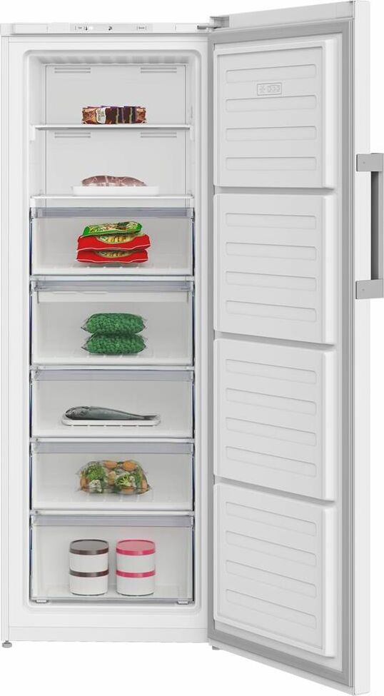 Вертикальный морозильник. Размеры (ВхШхГ), см: 171,4х60х65. Общий объем 290 л. Полезный объем 255 л. 1 компрессор (R600a). Электронное управление, внутренний дисплей. Система размораживания: No Frost. Быстрая заморозка Quick Freeze. Время сохранения t°C без электричества: 18 ч. Уровень шума: 40 дБ. Перенавешиваемая дверца. Внешняя ручка. Антибактериальное покрытие резинового уплотнителя. Cигнал открытой двери, 5 ящиков, 2 отделения с откидной крышкой, лоток для льда, лоток для пельменей. Мощность замораживания: 16 кг/24 ч. Климатический класс: SN-T. Класс энергетической эффективности: А+. Энергопотребление в год: 310 кВт/ч. Цвет: белый.