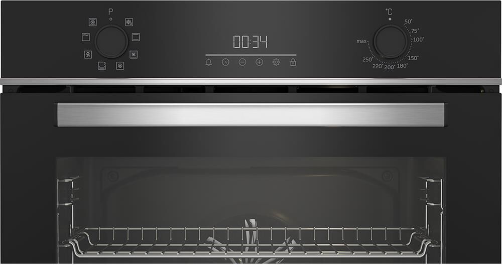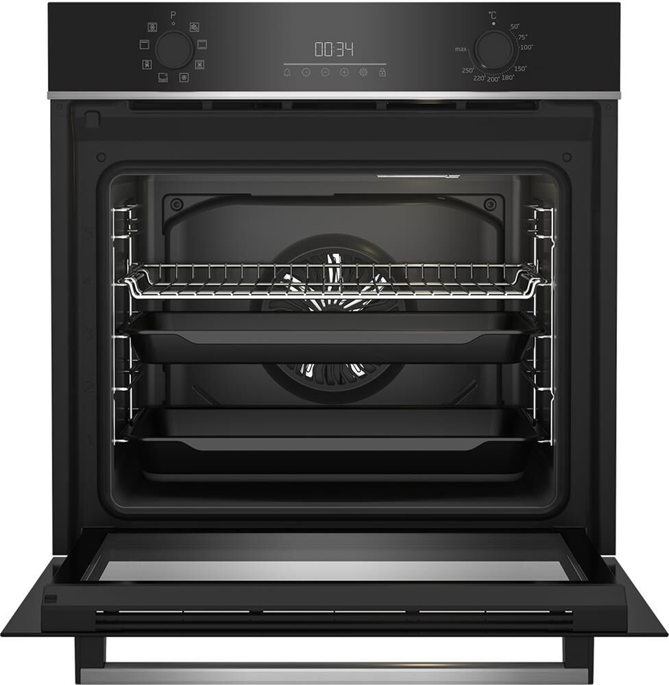 Электрический духовой шкаф; 8 режимов; LED дисплей; утапливаемые поворотные переключатели; система очистки паром; металлические направляющие; объем — 72л; 2 стекла дверцы; 1 решетка; 1 противень; Цвет: Черный; Материал панели управления: Металл + Стекло