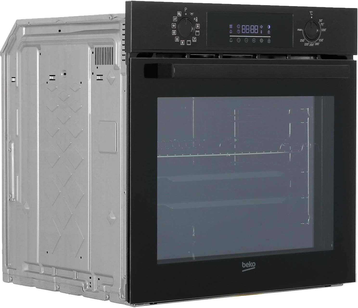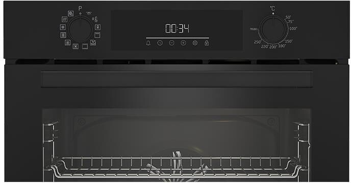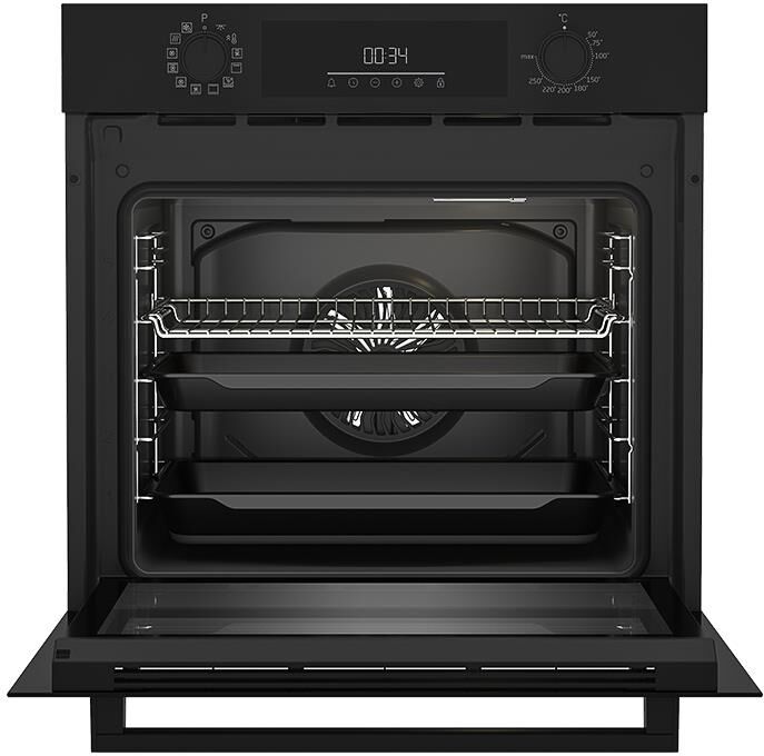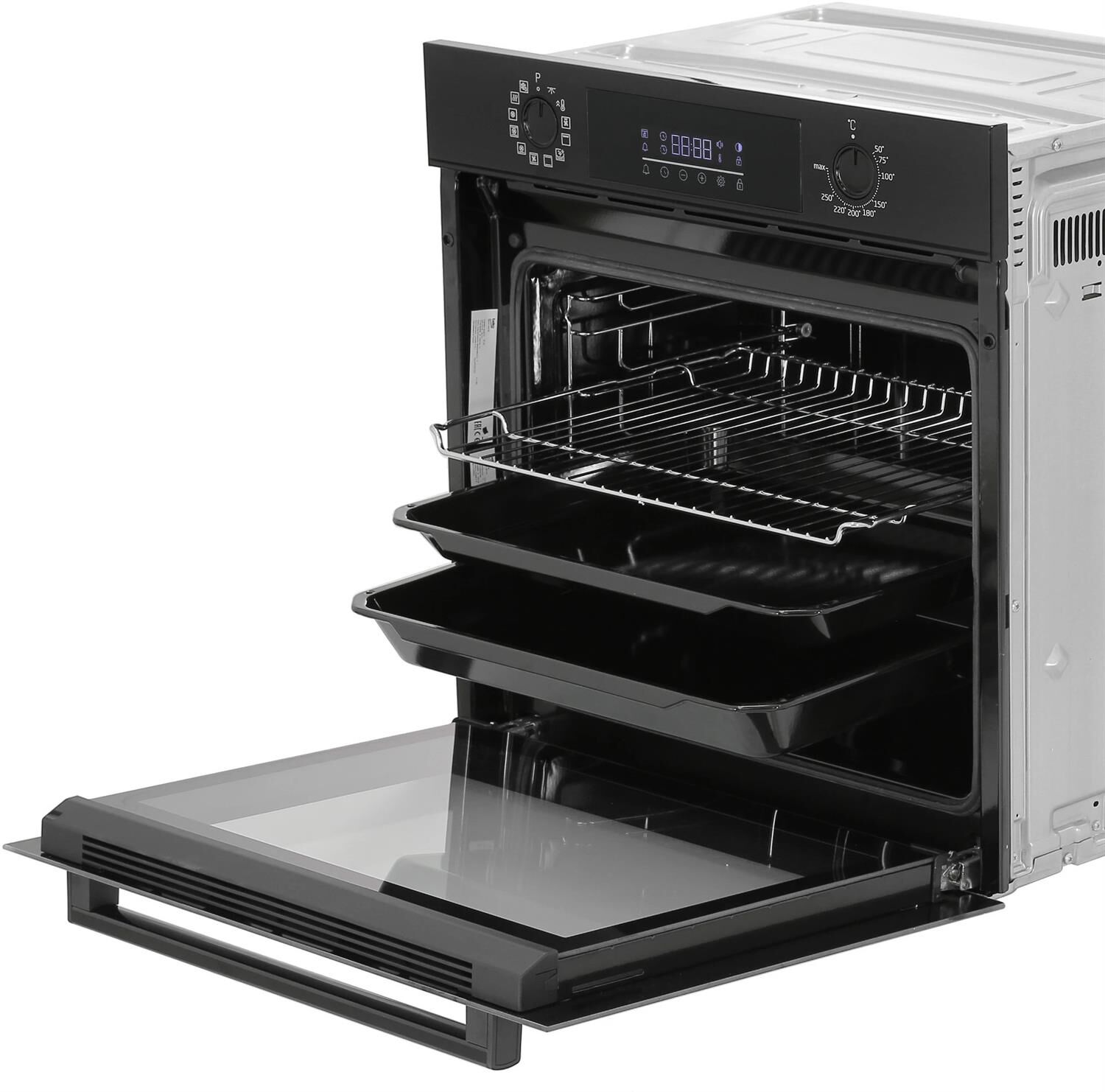 Электрический духовой шкаф; 12 режимов; LED дисплей; поворотные переключатели; металлические направляющие; объем — 72л; 2 стекла дверцы; 1 решетка; 1 противень; 1 глубокий противень; Цвет: Черный