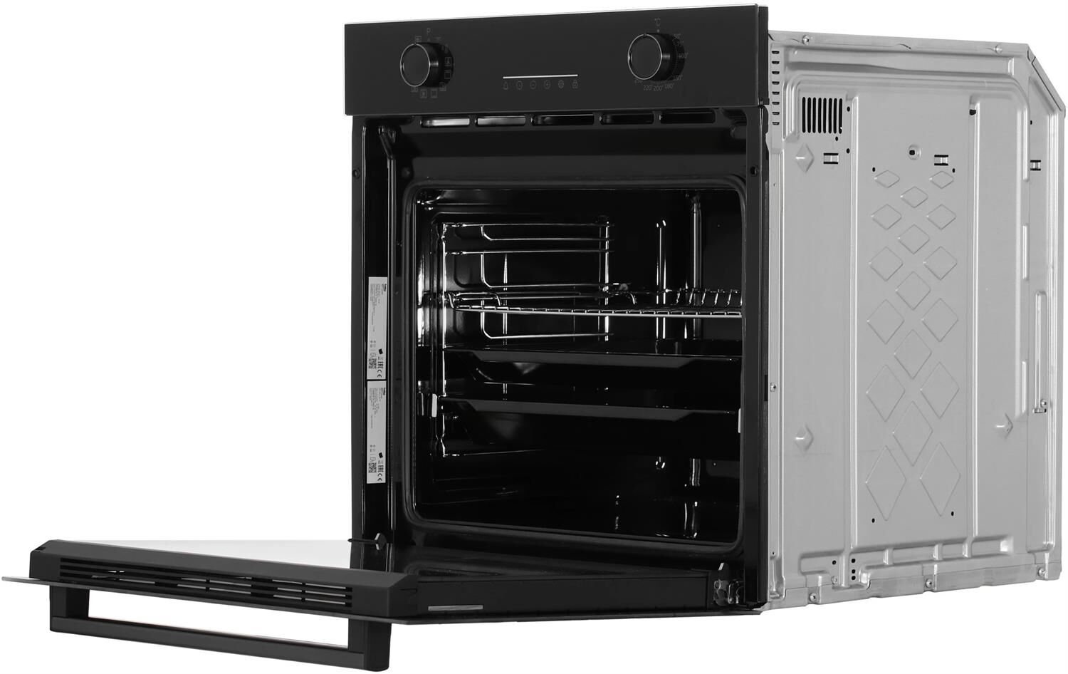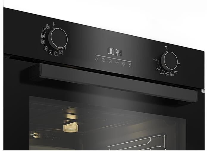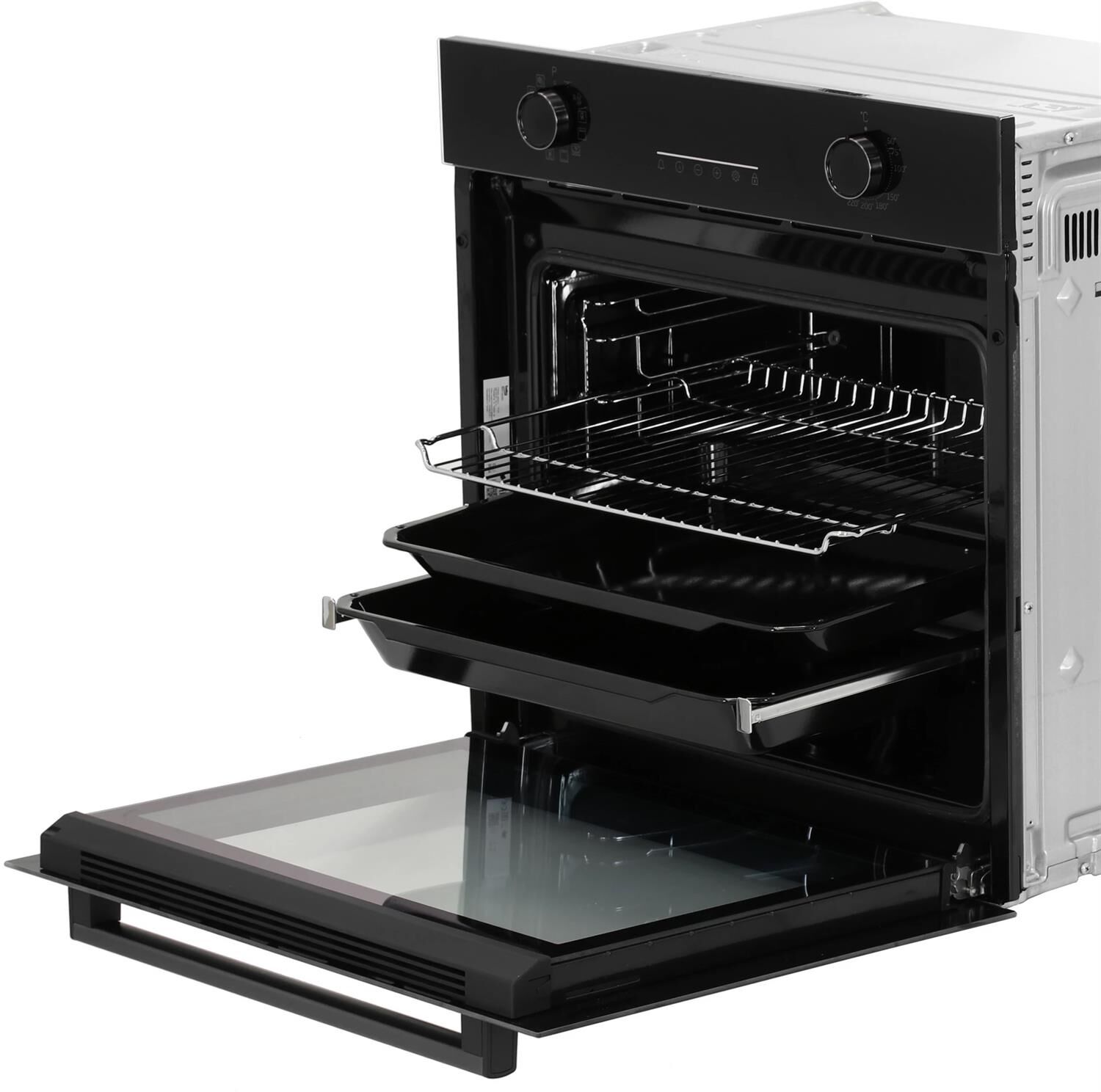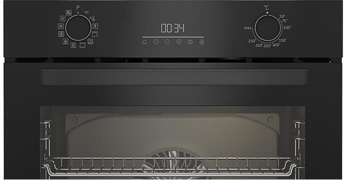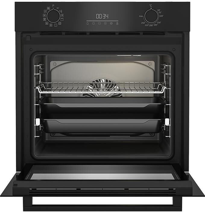 Электрический духовой шкаф; 12 режимов; LED дисплей; каталитическая очистка (задняя стенка); поворотные переключатели; телескопические направляющие на одном уровне; объем — 72л; 2 стекла дверцы; 1 решетка; 1 противень; 1 глубокий противень; Цвет: Черный