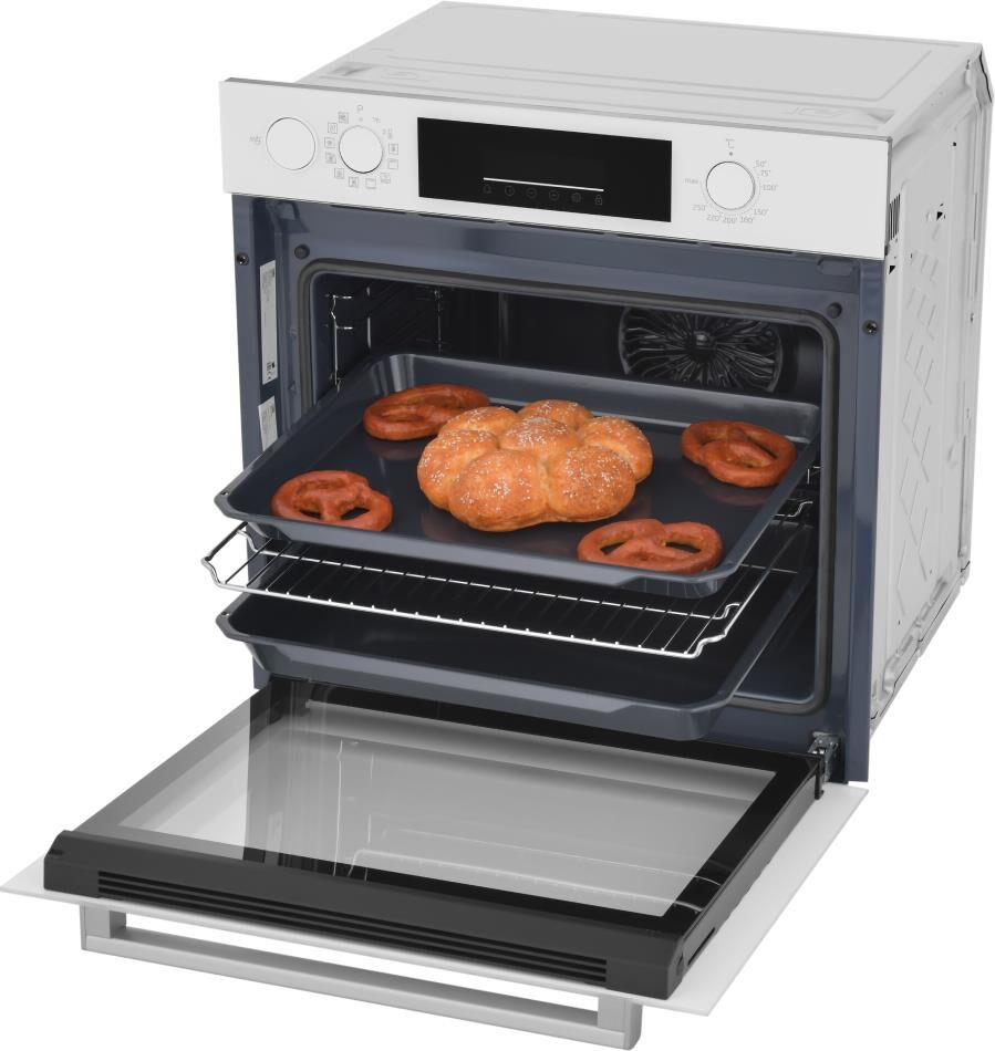 Размеры без упаковки (ВхШхГ), см — 59,5×59,4×56,7. Электрический духовой шкаф; 12 режимов; Приготовление с паром (резервуар на панели управления); LED дисплей; утапливаемые поворотные переключатели; система очистки паром; металлические направляющие; объем — 72л; 2 стекла дверцы; 1 решетка; 1 противень; 1 глубокий противень; Цвет: Белый; Материал панели управления: Стекло