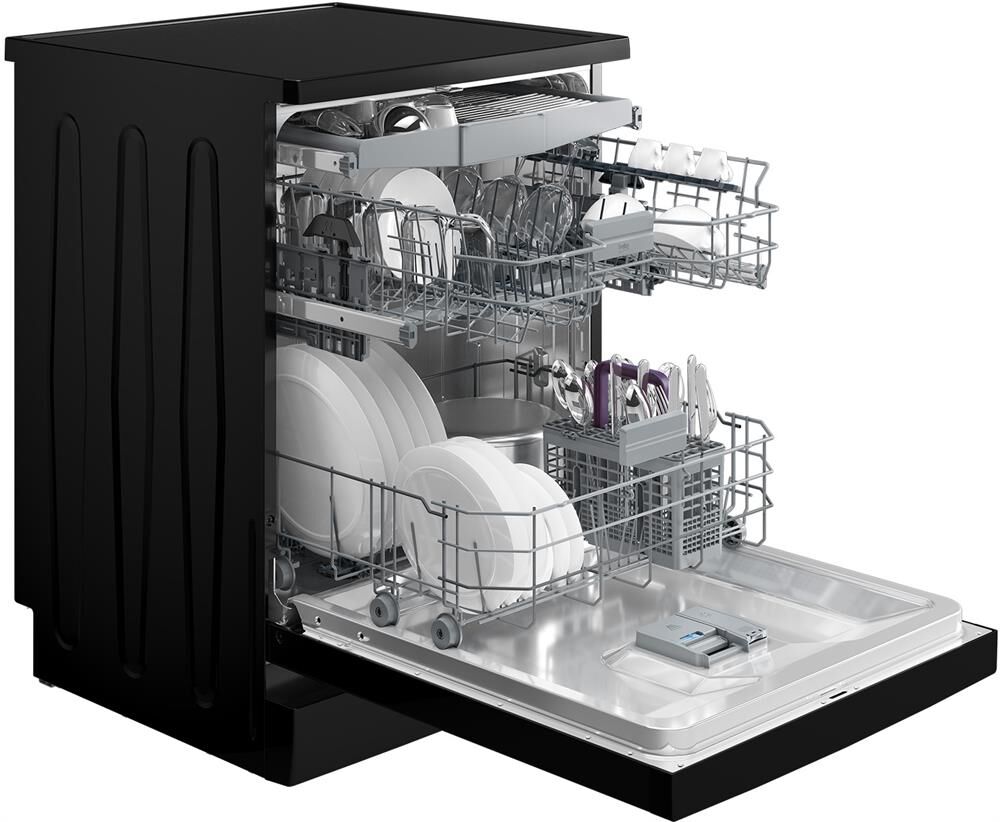 универсальный мотор, кнопочное управление, 5 программ, 15 комплектов, 3-я корзина, регулировка верхней корзины по высоте, конденсационная сушка, расход воды 9,9 л., уровень шума 44 дБ, частичная защита от протечек WaterSafe, автоматическое открывание дверцы, черный
