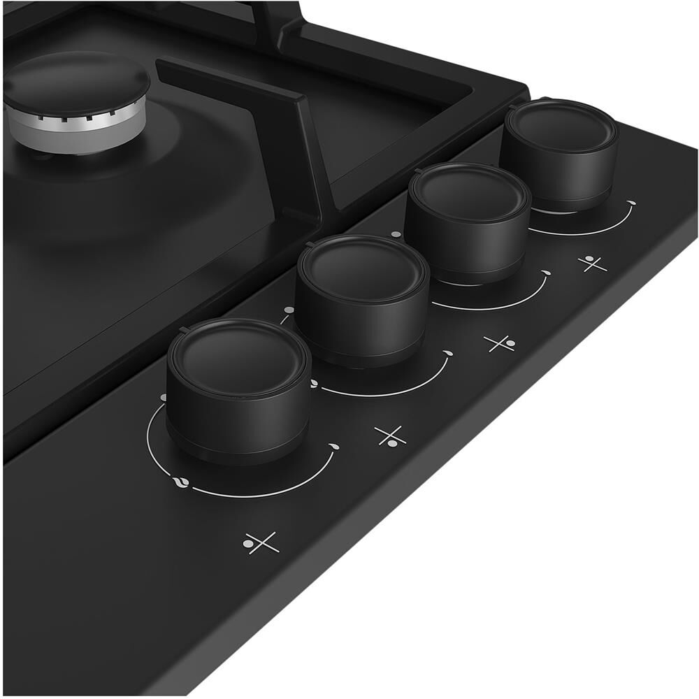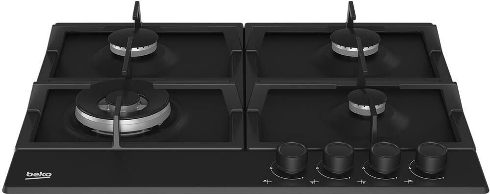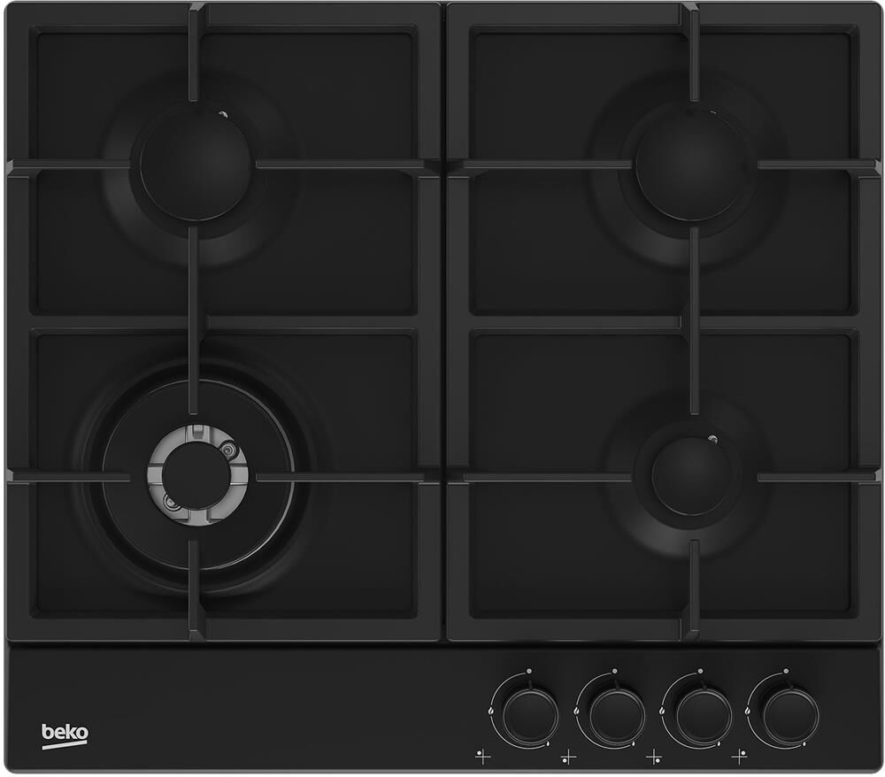 Газовая варочная поверхность (газ на металле), 4 зоны, одна зона с двойным уровнем пламени; автоподжиг, газ-контроль, чугунные решетки, цвет: черный