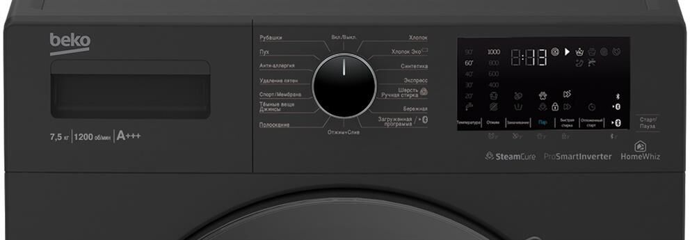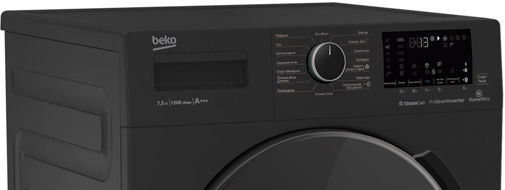 (ВхШхГ)84х60х45см.Цвет антрацит.Цвет люка Премиальный люк (темное стекло). Электронное управление.Загрузка 7,5кг.Класс энергопотребления A -20%.Класс стирки A.Класс отжима B.Кол.программ 15.Дисплей Сенсорный.Отложенный старт 0-24 ч.Максимальная скорость отжима 1200 об/мин.Потребление электроэнергии 1.125 кВт.Расход воды 55 л.Уровень шума при стирке 63 дБ(А).HomeWhiz, беспроводное управление WiFi.Электронный контроль дисбаланса.Инверторный мотор ProSmart.Технология обработки паром SteamCure.Нагревательный элемент Hi-Tech с защитой от накипи.Контроль пенообразования.Вес62кг.