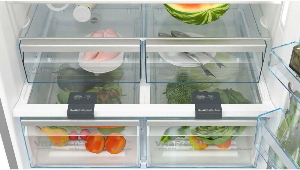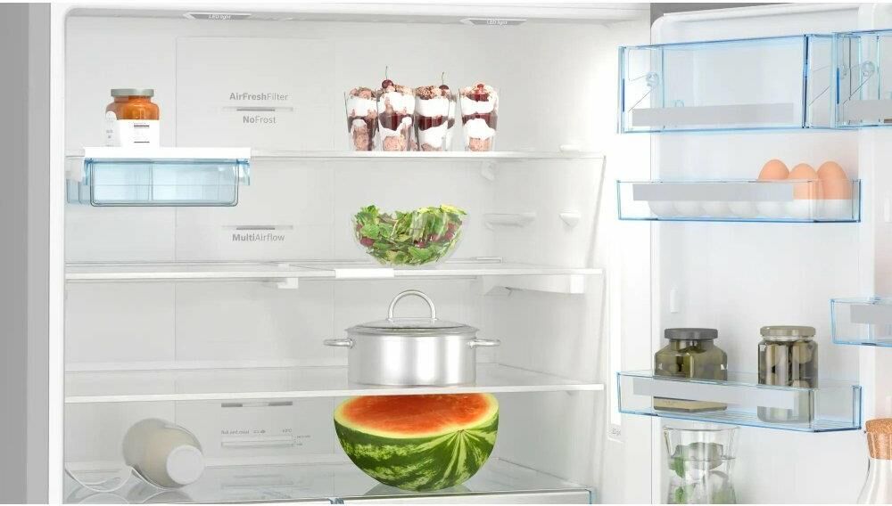Количество камер: двухкамерный. Расположение морозильной камеры: снизу. Тип управления: сенсорное. Класс энергопотребления: A++. Система размораживания: No Frost. Уровень шума: 40. Количество компрессоров: один. Хранение при отключении питания: 30. Мощность замораживания: 20. Количество полок: 4. Количество ящиков: 2. Материал полок: закаленное стекло. Зона свежести: есть. Система размораживания: No Frost. Тип: Холодильник. Полезный объем холодильника: 619. Полезный объем холодильной камеры: 479. Полезный объем морозильной камеры: 140. Хладагент: R600a. Количество ящиков: 4. Вес (нетто): 114. Количество дверей: 2. Тип компрессора: стандартный. Габариты упаковки (ед) ДхШхВ: 0.92×0.88×1.925. Вес упаковки (ед): 118.3. Страна производства: Турция. Количество полок на дверце: 6. Материал дверей: металл. Наличие морозильной камеры: есть. Технология зоны свежести: VitaFresh plus. Технология многопоточного охлаждения: MultiAirflow. Технология суперзаморозки: SuperFreezing. Тип дисплея: внешний. Европейский класс энер