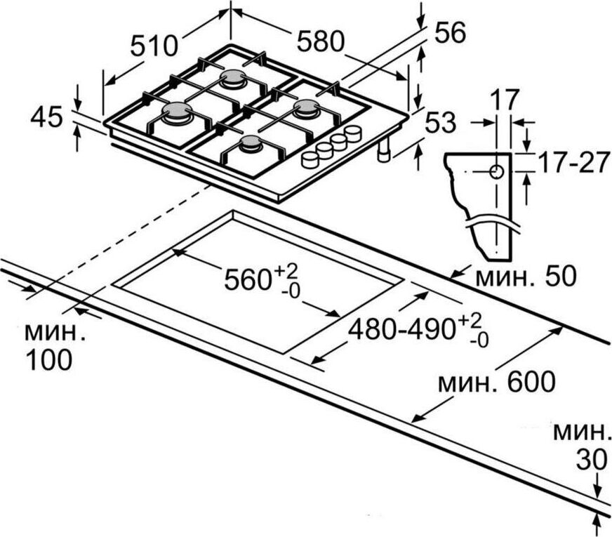 Газовая варочная панель. Размеры (ШxГ): 580 х 540 мм; Эмалированная поверхность, 4 конфорки. Напряжение — 220-240 В. Цвет — черный.