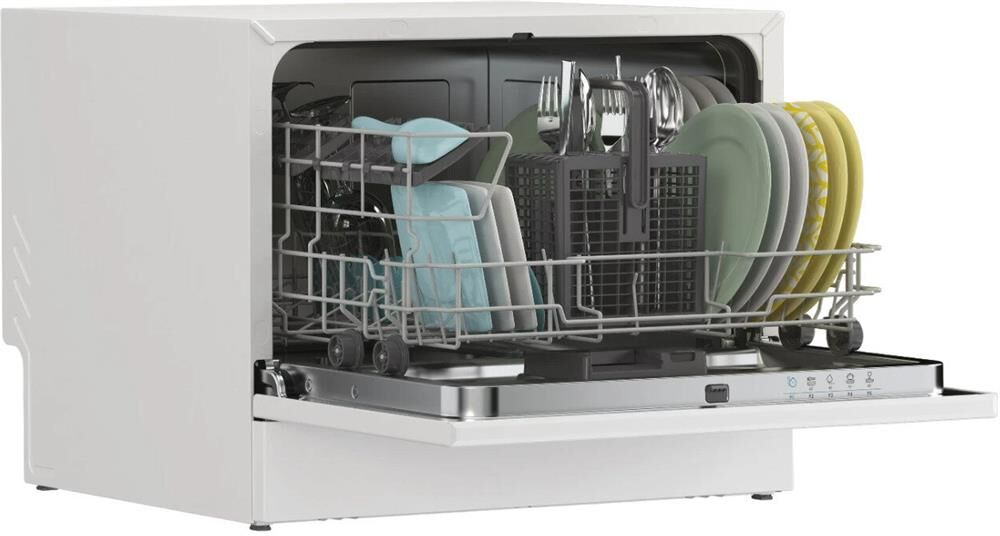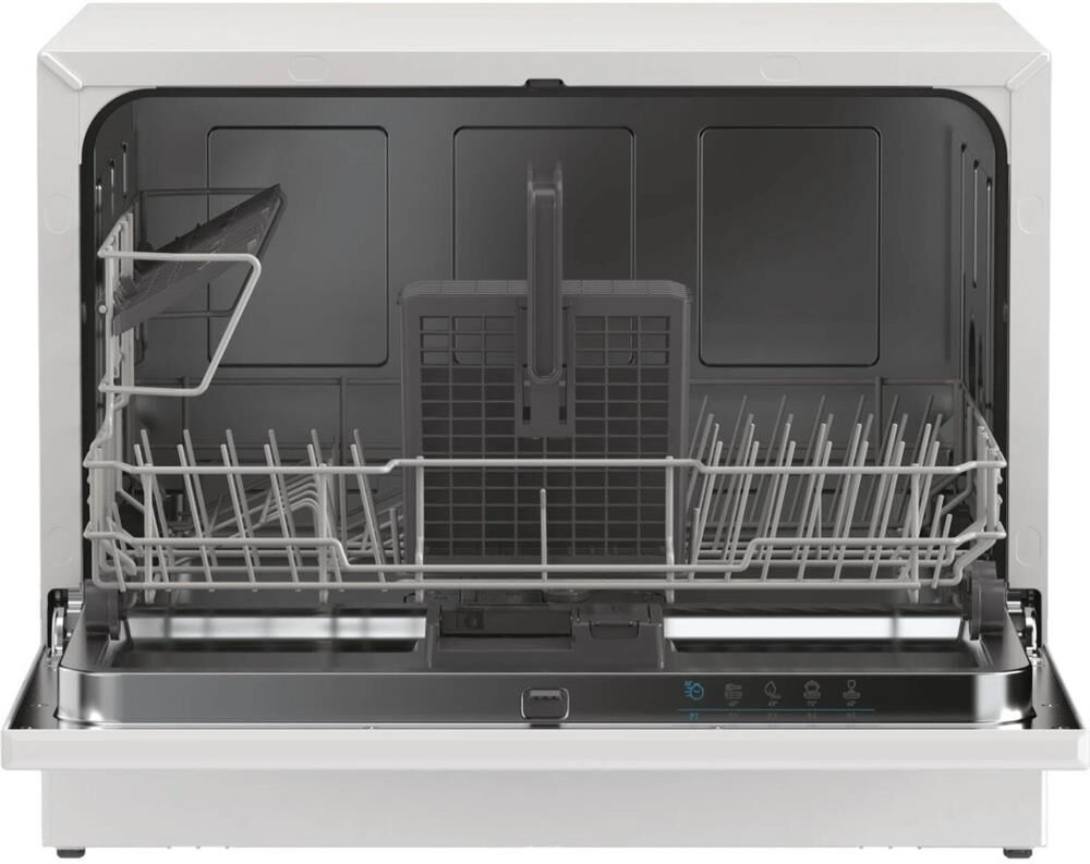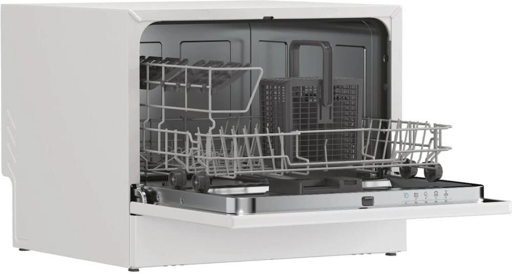 (ВxШxГ)44.3 х 55 х 50.1см.Цвет белый.Загрузка, кол-во комплектов 6. Количество разбрызгивателей 1. Отсрочка старта, ч 3 / 6 / 9. Количество уровней разбрызгивания 1. Звуковой сигнал по окончании мойки. Количество программ 5.Класс сушки B Потребление электроэнергии, кВтч/г 174 Параметры расхода воды, л/г 1820 Номинальное напряжение / частота 220-240 В / 50 Гц Мощность подключения 850-1050 Вт Расход воды, л 6.5 Номинальный ток предохранителя 10 A Материал бака Пластиковое дно Уровень шума, дБ 51 Класс энергоэффективности A Подключение к воде Мотор Индукционный Дисплей LED Индикатор соли Индикатор ополаскивателя