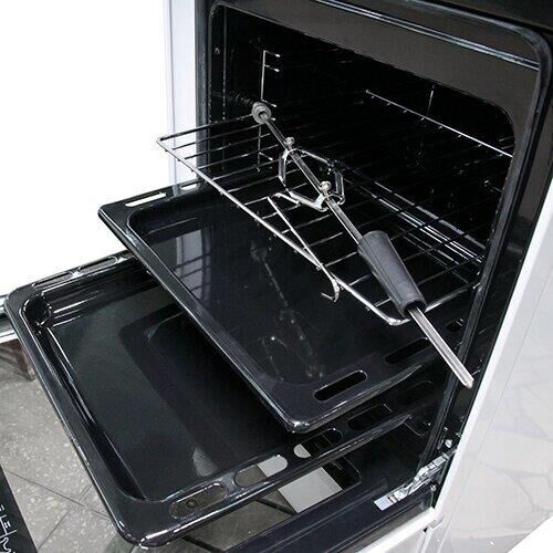 Габариты 850*500*500 Вес, кг — 39 Основные характеристики варочной поверхности: Электророзжиг 4 газовые конфорки 1,0/1,75/1,75/3,0 кВт Основные характеристики духового шкафа: Терморегулятор Освещение Вертел Гриль Механический таймер Объём духовки 43 л. Комплектация: Большой противень Малый противень Чугунная решётка Решётка для жарки Стеклянная крышка рабочего стола Хозяйственный отсек Техническое описание: Цвет — белый