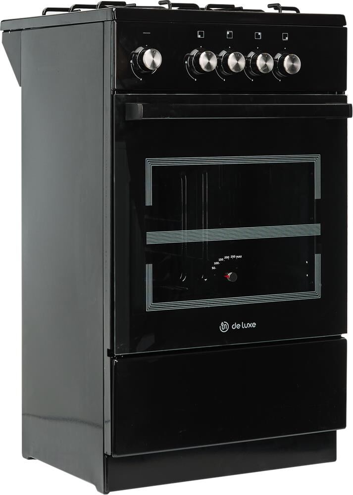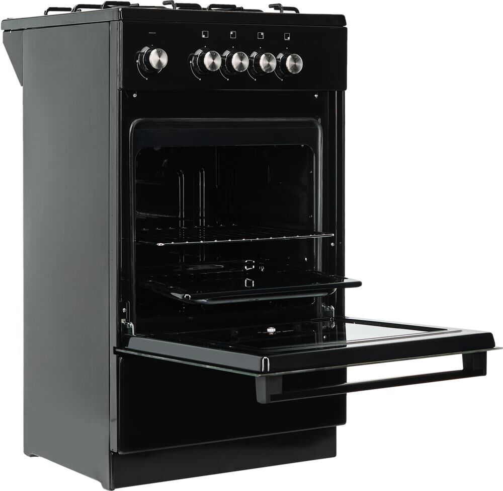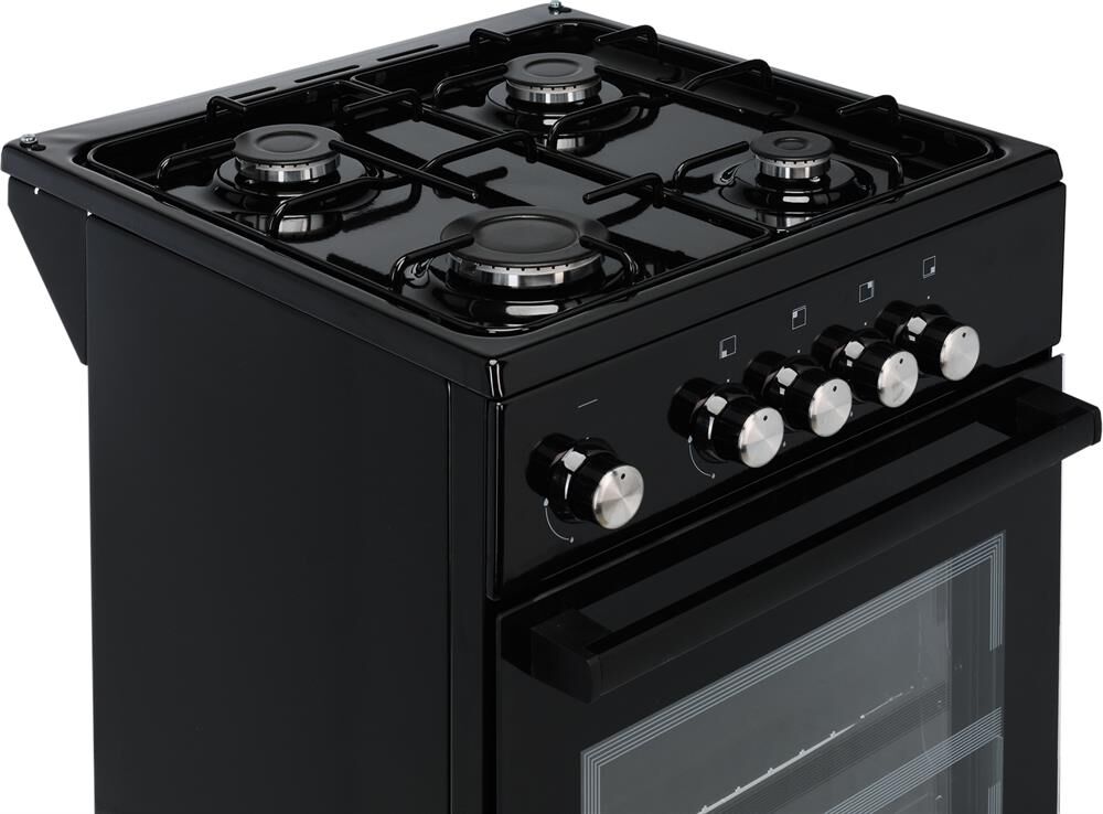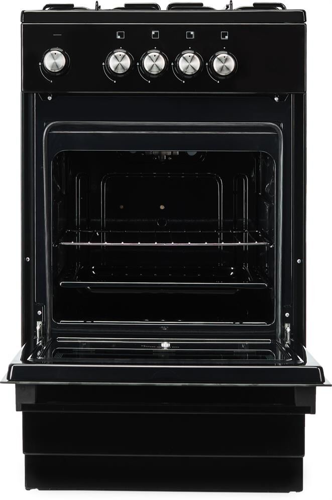 Типоразмер 50*50см, духовка с газ-контролем духового шкафа, духовка — 43 л, 1 противень, цвет черный, черная эмалированная решетка рабочего стола, ЦВЕТ ЧЕРНЫЙ ГЛЯНЦЕВЫЙ. Данная модель дополнена удобным ящиком для хранения кухонных принадлежностей.
