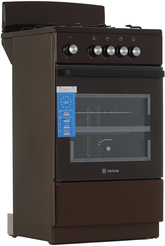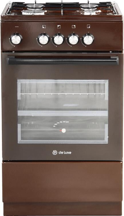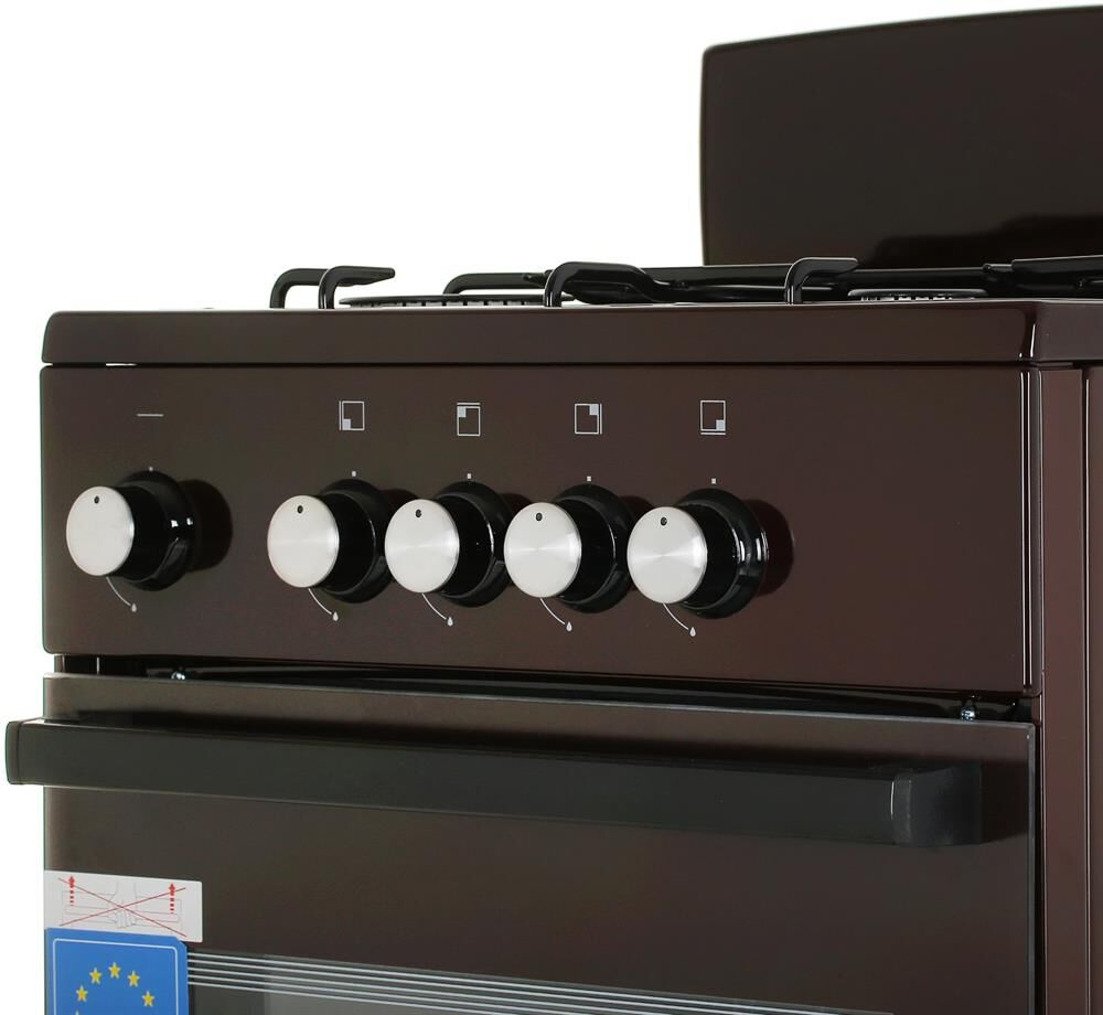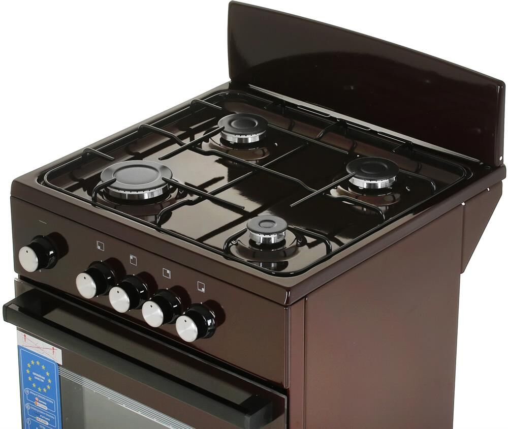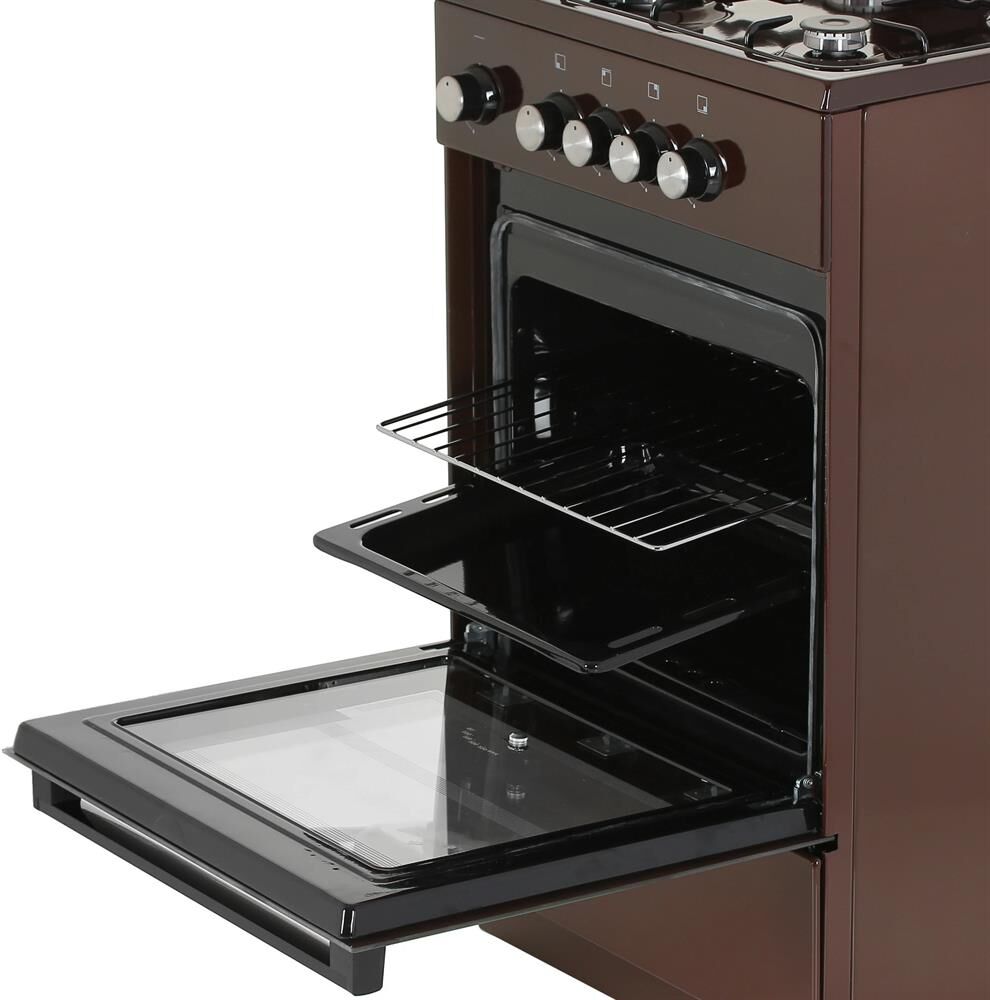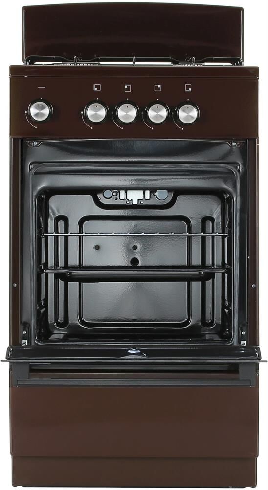 Типоразмер 50*50см, духовка с газ-контролем духового шкафа, 1 противень, цвет белый, черная эмалированная решетка рабочего стола, КОРИЧНЕВЫЙ ЦВЕТ