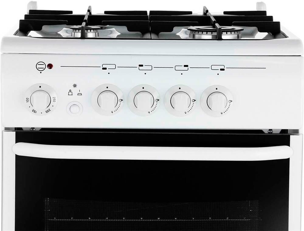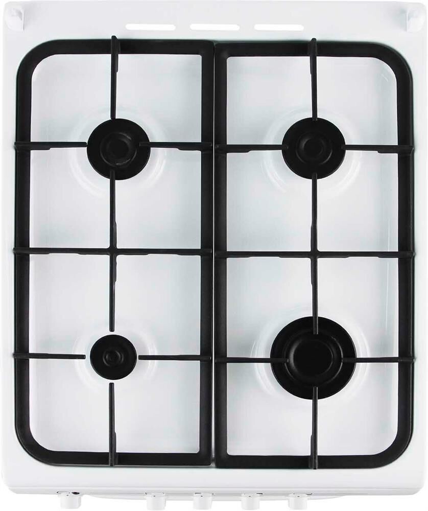 Размеры, мм — высота/ширина/глубина – 850/500/600 * Вес, кг — 36 * Цвет белый * 4 газовые конфорки 1,0/1,75/1,75/3,0 кВт Основные характеристики духового шкафа: Электрическая духовка. Нижний ТЭН — 1,2 кВт. Верхний ТЭН — 0,8 кВ. Терморегулятор. Освещение. Объём духовки 54 л. * Стеклянная крышка рабочего стола * Хозяйственный отсек *