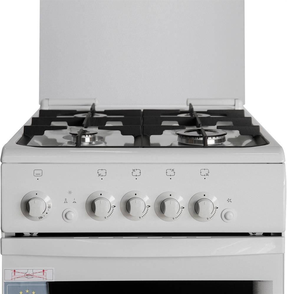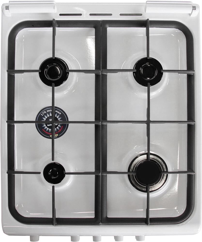 Габариты 850*500*600 Вес, кг — 36 Объём духовки 60 л. Основные характеристики варочной поверхности: Электророзжиг 4 газовые конфорки 1,0/1,7/1,7/3,0 кВт Основные характеристики духового шкафа: Электророзжиг Газ-контроль Освещение Комплектация: Большой противень Малый противень Решётка для жарки Чугунная решётка Стеклянная крышка рабочего стола Хозяйственный отсек Техническое описание: Цвет — белый