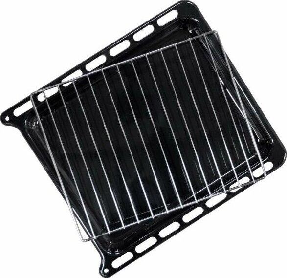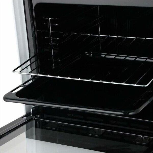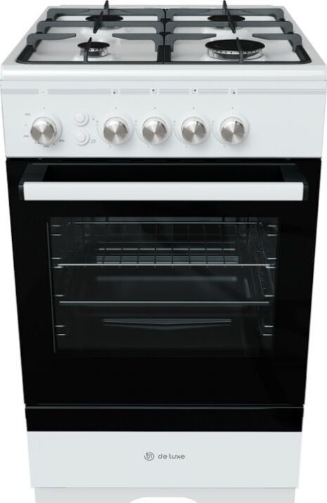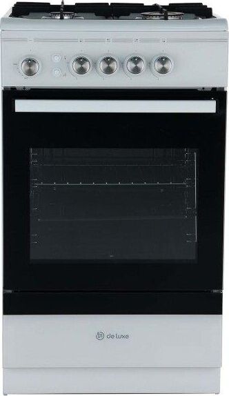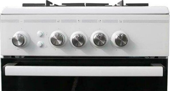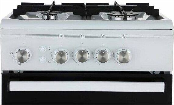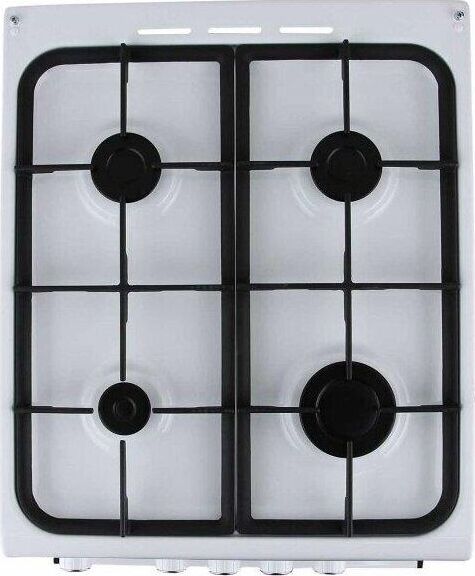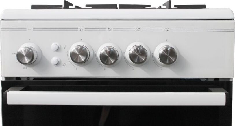 Размеры, мм — высота/ширина/глубина – 850/500/600 * Цвет — белый, стеклянный фасад * Вес, кг – 39 * Основные характеристики варочной поверхности: 4 газовые конфорки 1,0/1,75/1,75/3,0 кВт. Электророзжик раб.стола * Основные характеристики духового шкафа: Горелка основная 2,5 кВт с УКП. Газ-контроль. Объём духовки 54 л. * Чугунная решётка * Хозяйственный отсек *