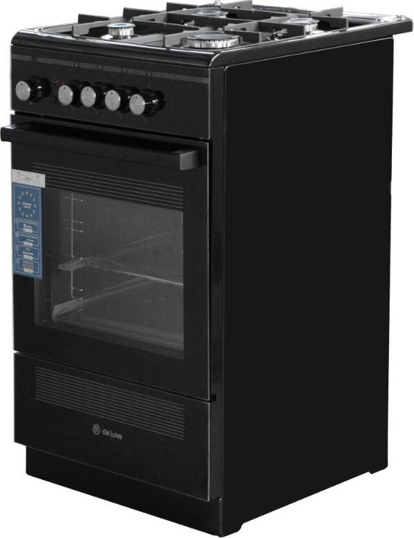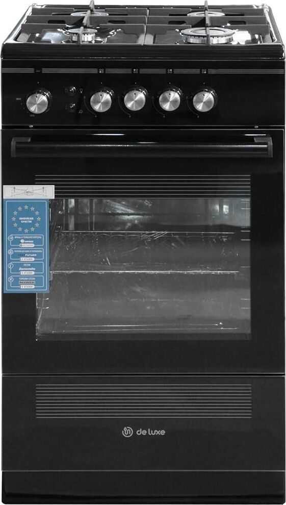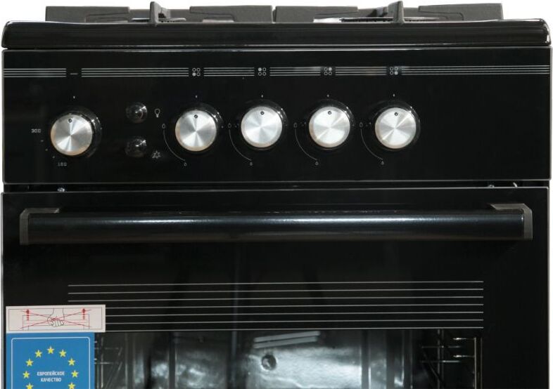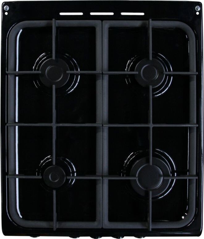 Размеры, мм — высота/ширина/глубина – 850/500/600 * Цвет — черный, стеклянный фасад *Основные характеристики варочной поверхности: 4 газовые конфорки 1,0/1,75/1,75/3,0 кВт. Электророзжик раб.стола * Основные характеристики духового шкафа: Горелка основная 2,5 кВт с УКП. Газ-контроль. Объём духовки 54 л. * Чугунная решётка * Хозяйственный отсек *