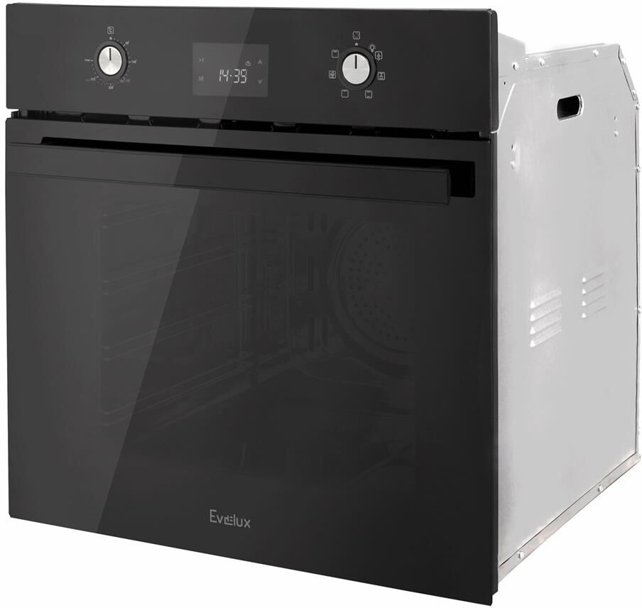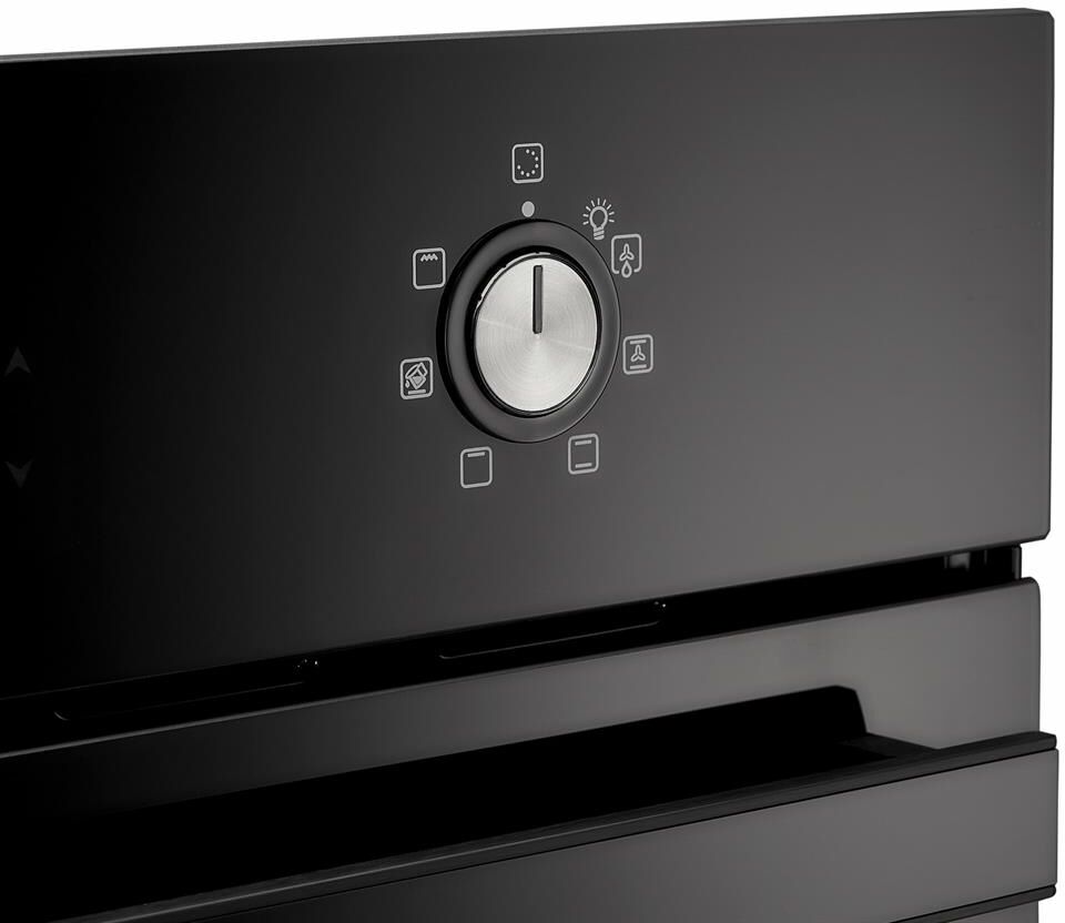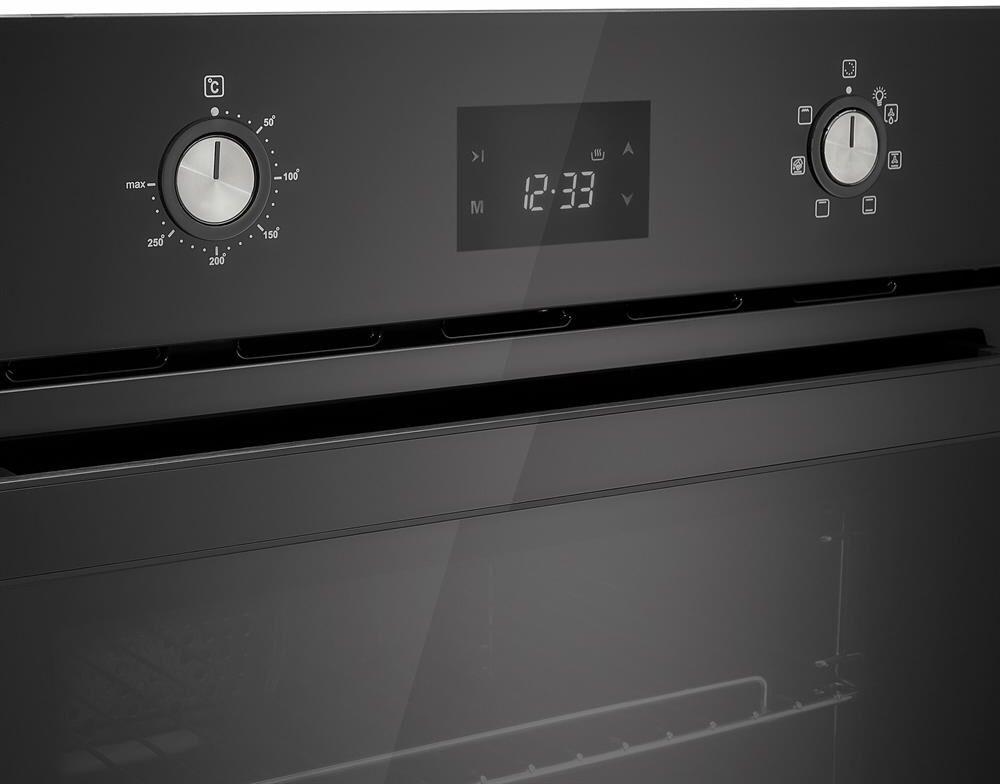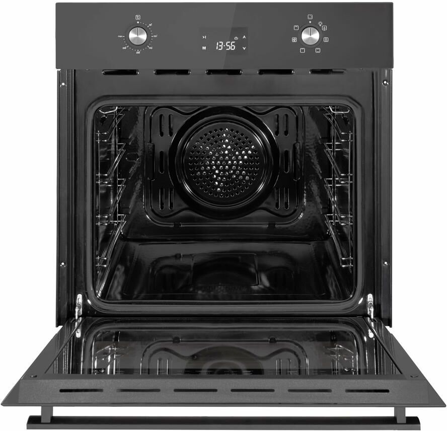 Электрический духовой шкаф встраиваемый полноразмерный, 60 см, 7 режимов, объем духовки 65л, утапливаемые переключатели, дисплей Snow White, фронтальная поверхность Full Black, хромированные боковые решетки, панель управления — черное стекло, универсаль