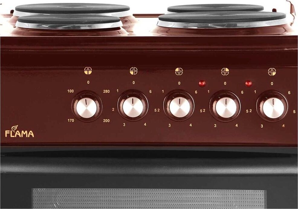 Flama L FE 14010 B — простая в эксплуатации и уходе электрическая плита. Объем духовки 50 л. Стекло дверцы духовки 2-слойное. Тип очистки традиционный. Режимы работы духовки 4. Максимальная температура 270 *С. Тип конфорок чугун. Тип освещения лампа накаливания. Тип управления механический. Материал варочной поверхности эмаль. Внутреннее покрытие эмалированная сталь. Ящик для посуды откидной. Крышка варочной поверхности металлическая. Габаритные размеры (В*Ш*Г) 85*50*60см. Класс энергоэффективности C. Потребляемая мощность 5500 Вт. Вес 33кг. Цвет коричневый.