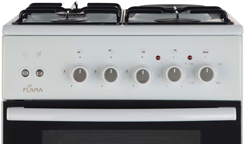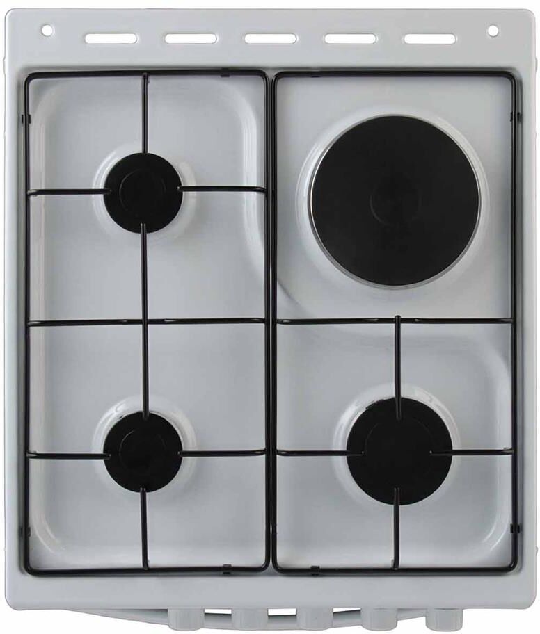 Габаритные размеры (В*Ш*Г) 85*50*60 см. * Цвет белый * Комбинированная плита позволяет готовить еду на трёх газовых конфорках различной мощности, а также ещё на одной конфорке и в духовке, работающих на электричестве. Скребок в комплекте Съемная дверца. Быстрый разогрев духовки. Противень ProCook. Тип плиты комбинированная (газ/электро) Тип духовки электрический. Объем духовки 50 л. Стекло дверцы духовки 2-слойное. Тип очистки традиционный. Режимы работы духовки 4. Максимальная температура 270 *С. Тип конфорок газ/чугун. Тип освещения лампа накаливания. Тип управления механический. Внутреннее покрытие эмалированная сталь. Решетка чугунная. Крышка варочной поверхности стеклянная. Ящик для посуды откидной. Класс энергоэффективности C. Потребляемая мощность 3000 Вт. Вес 33 кг.