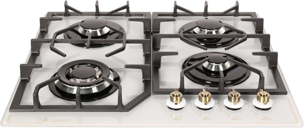Размеры монтажного проема, ШхГ, см 55,4 х 48,6 * Ширина, см 60, Глубина, см 52,5. Высота, см 10 * Тип подключения Газовый * Количество зон приготовления 4 * Цвет модели Белый * Дизайн Ретро * Материал варочной поверхности Стекло * Материал решеток варочной поверхности Чугун * Газ-контроль горелок стола. Электророзжиг горелок стола Розжиг встроен в ручки * Двухзонная горелка варочной поверхности *