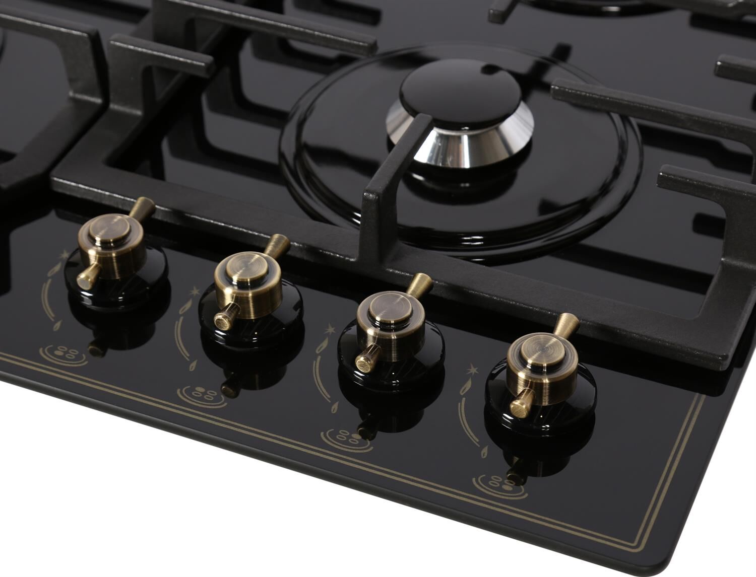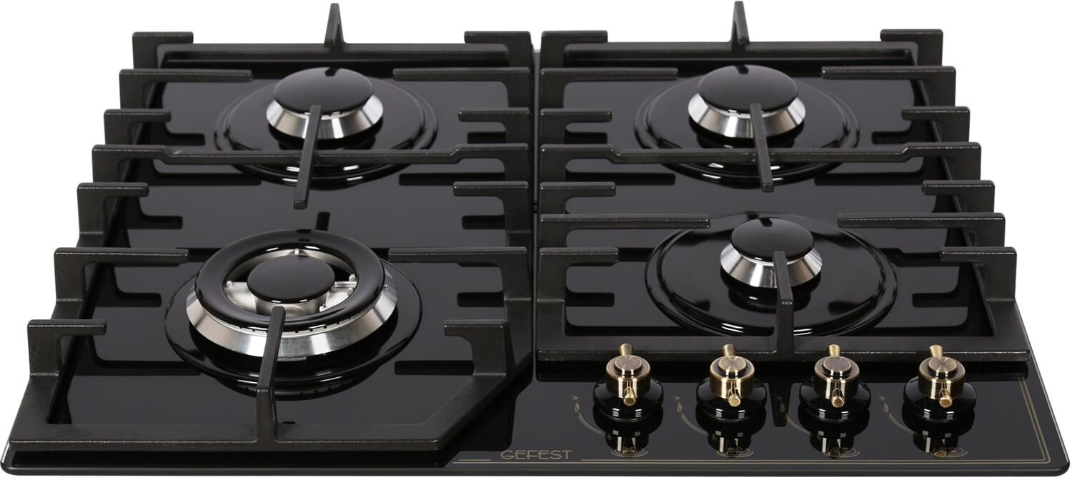 Размеры монтажного проема, ШхГ, см: 55,4 х 48,6; Ширина, см: 60; Глубина, см 52,5; Высота, см: 10; Вес: 13,5 кг; Цвет: Черный; Всего конфорок на варочной панели: 4; Тип подключения: Газовый; Материал рабочей поверхности: Стекло; Решетка: Чугун; Механическое управление; Электроподжиг автоматический; Поворотные переключатели; Газ-контроль конфорок; Тип подключения: Газовый; Газ-контроль горелок стола; Электропджиг горелок стола встроен в ручки
