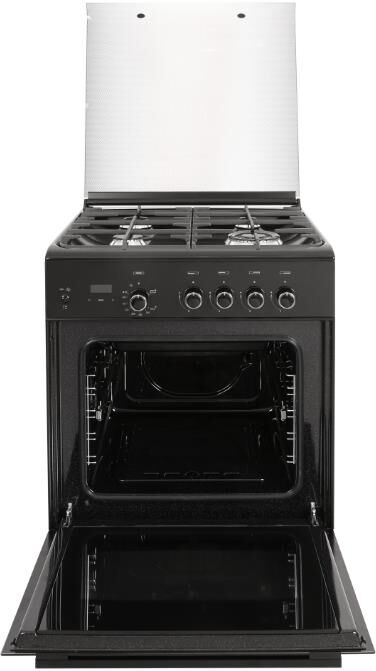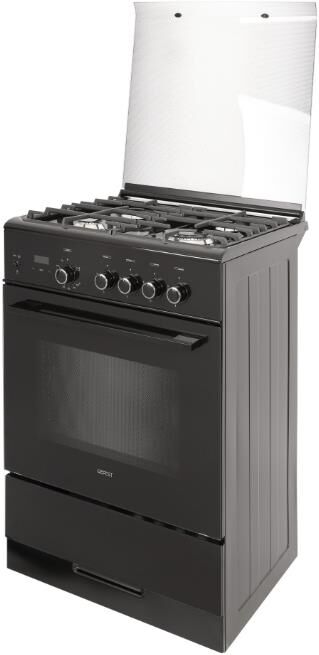 Габариты ШхГхВ, см: 60х60х85; Тип подключения: Газовый; Объем духового шкафа, л: 52; Количество зон приготовления: 4; Цвет: Черный; Материал варочной поверхности: Эмаль; Материал решеток варочной поверхности: Чугун; Двухзонная горелка варочной поверхности; Крышка плиты: Стеклянная; Газ-контроль горелок стола; Газ-контроль духового шкафа; Электророзжиг горелок стола: Розжиг встроен в ручки; Электророзжиг духового шкафа: Розжиг встроен в ручки; Таймер: Сенсорный; Тип направляющих духового шкафа: Съемные проволочные; Тип очистки: Гидролизная; Внутреннее покрытие духового шкафа: Эмаль легкой очистки SMART CERAMIC; Количество стекол в дверце духового шкафа: 2; Телескопические полки; Ящик для посуды и принадлежностей: Выдвижной ящик; Внутреннее освещение духового шкафа: Одинарное; Контроль температуры духового шкафа: Термостат; Гриль; Нижний нагрев; Горелка гриль, Вт: 1900; Диапазон номинального напряжения сети, В: 220-230