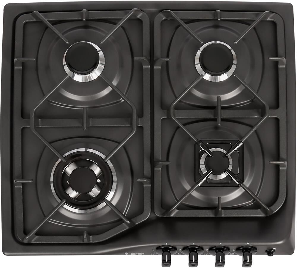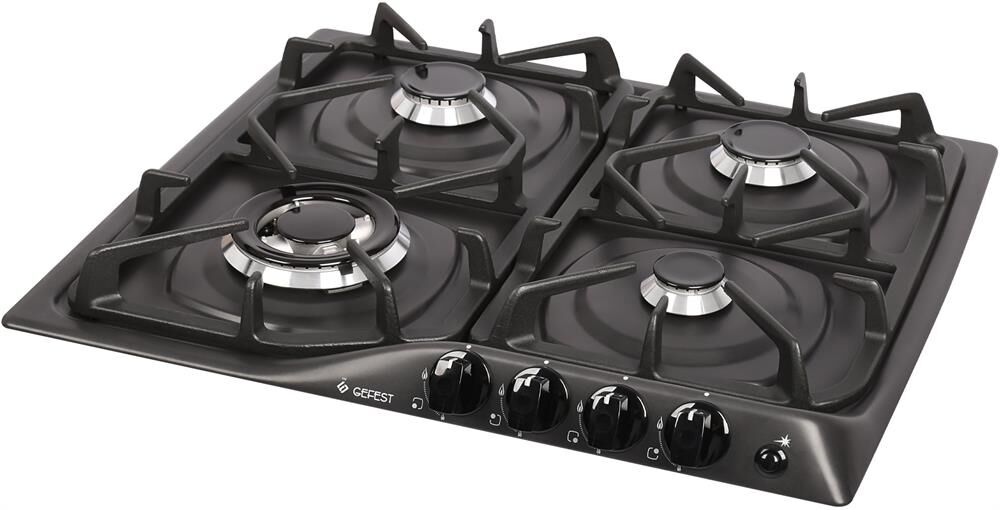 Габаритные размеры ШхГхВ: 59х52х8.5 см * Цвет: черный. Варочная поверхность: эмалированная * Газ-контроль горелок стола * Чугунные решетки горелок стола * Фиксированное положение «малое пламя» * Электророзжиг горелок, кнопка розжига на панели *