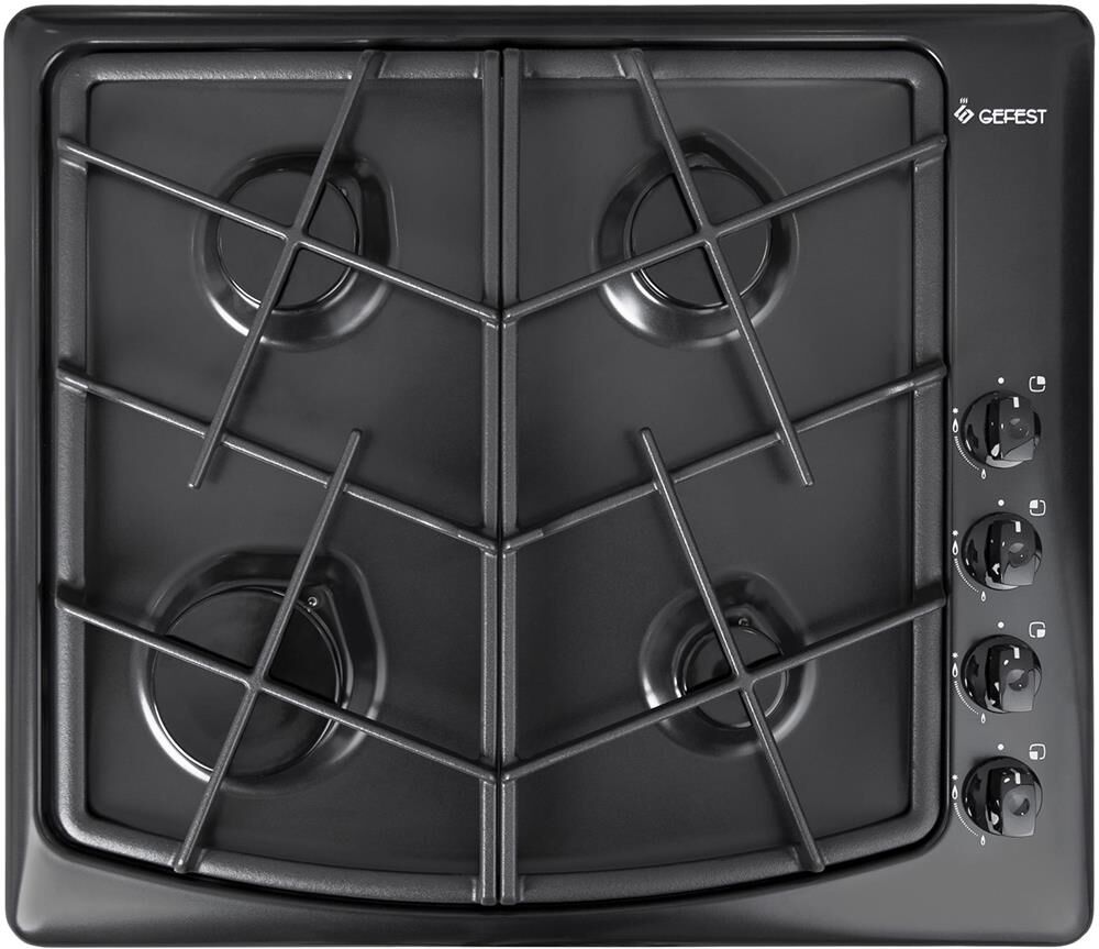 Габариты (ВхШхГ) 9,5х59х51см. 4 газ. горелки. Система «газ-контроль». Электророзжиг горелок стола. Чугунная решетка стола. Варочная поверхность: черная эмалированная.