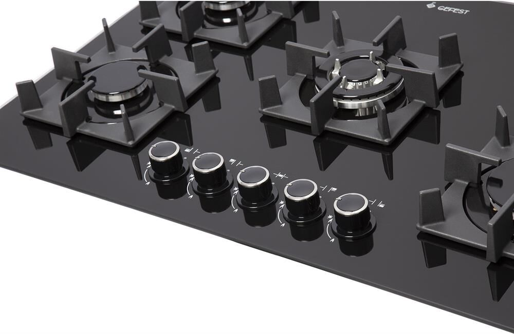 Габаритные размеры ШхГхВ: 80х52.5х10 см * Цвет: черный. Варочная поверхность: стеклянная. * Газ-контроль горелок стола * Чугунные решетки горелок стола * Трехконтурная горелка * Электророзжиг горелок, встроенный в ручки * Фиксированное положение «малое пламя»