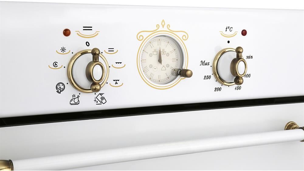 Духовой шкаф. Цвет: белый с рисунком "ретро". Цвет ручек управления: бронза. Габаритные размеры ШхГхВ: 59.8х56.5х59.5 см. Объём духовки: 55 л. Гриль электрический. Таймер аналоговый. Подсветка духовки двойная. Усиленный гриль с конвекцией. Съемные проволочные направляющие духовки. Диапазон номинальных напряжений, В: 220-230. Фасад: эмалированный. Сетевой шнур и вилка: в наличии. Класс электробезопасности: I.