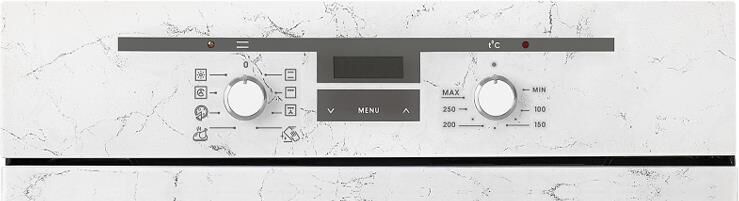 Габаритные размеры ШхГхВ: 59.8х56.5х59.5 см * Цвет: белый с рисунком "мрамор" * Объём духовки: 55 л * Тип: электрическая * Гриль электрический * Телескопические направляющие * Подсветка духовки двойная * Усиленный нагрев с конвекцией * Съемные проволочные направляющие духовки * Ускоренный нагрев с конвекцией * Таймер сенсорный *