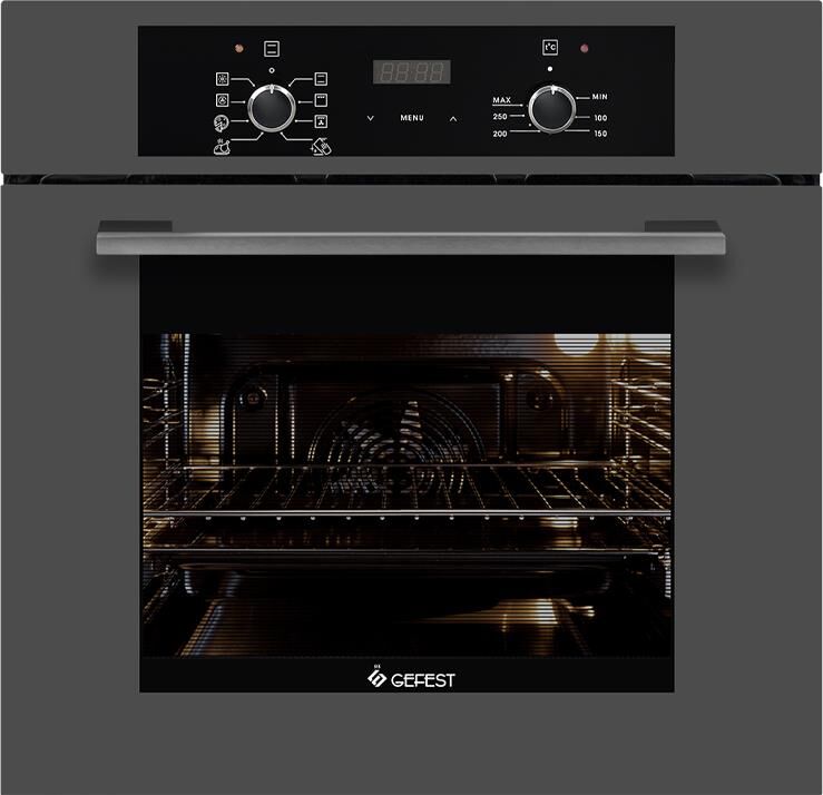 Духовой шкаф. Габаритные размеры ШхГхВ: 59.8х56.5х59.5 см. Цвет: серый. Объём духовки: 55 л. Таймер сенсорный. Гриль электрический. Телескопические направляющие. Подсветка духовки двойная. Усиленный гриль с конвекцией. Съемные проволочные направляющие духовки. Тип: электрическая. Фасад: стеклянный. Диапазон номинальных напряжений, В: 220-230 Сетевой шнур и вилка: в наличии. Класс энергоэффективности: A .Класс электробезопасности: I.