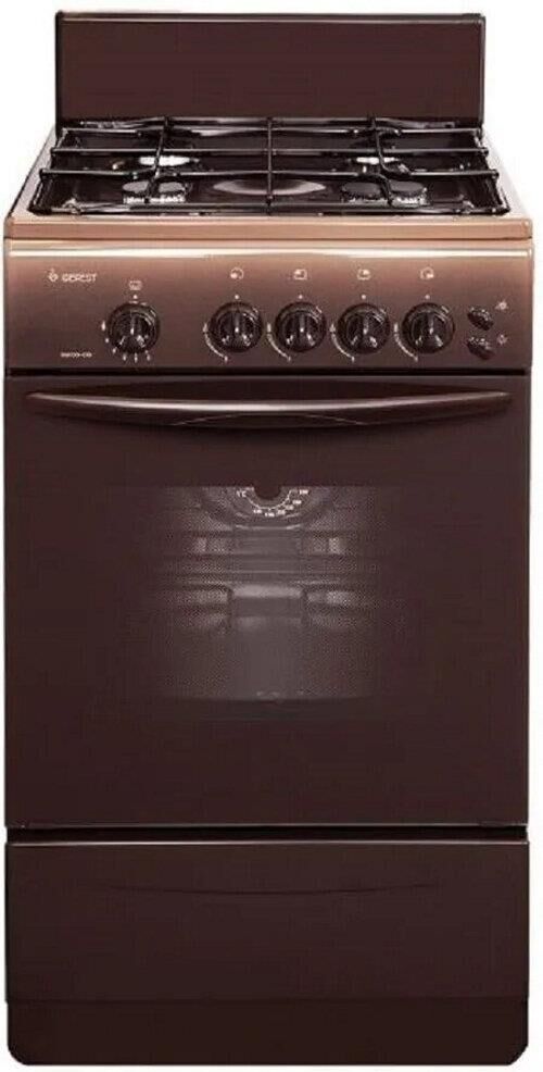 Габаритные размеры ШхГхВ: 50х53х85 см * Цвет: коричневый. Варочная поверхность: эмалированная * Полезный объём духовки: 42 л * Выдвижной ящик для посуды и принадлежностей * Стальные решетки горелок стола * Газ-контроль горелок стола * Термоуказатель духовки * Газ-контроль духовки * Штампованные направляющие духовки * Ножки регулировочные * Электророзжиг горелок, кнопка розжига на панели * Подсветка духовки одинарная *