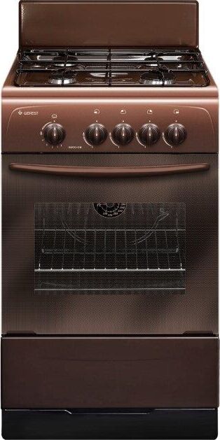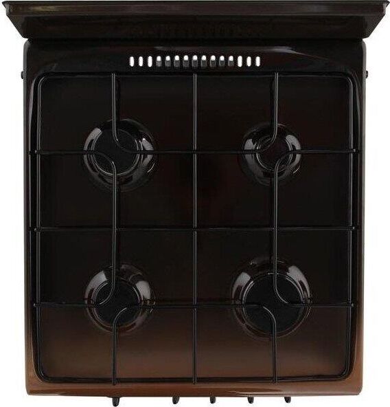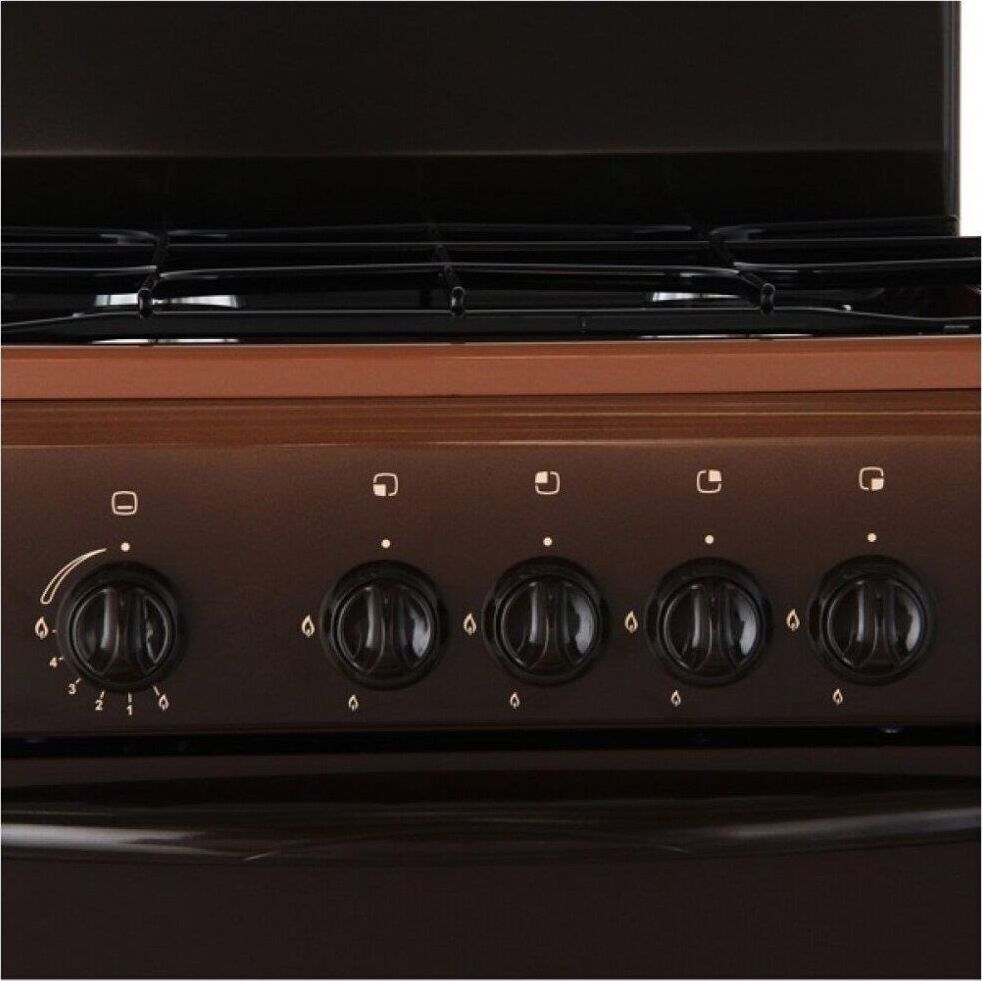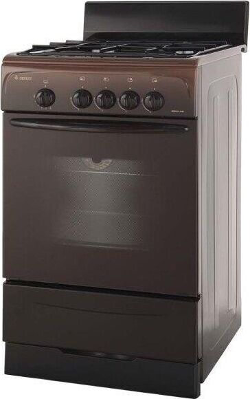 Газовая плита цвет коричневый. Габариты Ш/Г/В 50х53х85 см. Полезный объём духовки 42л. Варочная поверхность: эмалированная. Крышка: щиток. Газ-контроль горелок стола. Газ-контроль духовки. Стальные решетки горелок стола. Термоуказатель духовки. Ящик для посуды и принадлежностей с откидной крышкой.