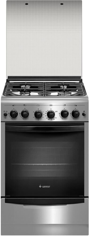 (ШхГхВ) 50×58,5×85 см. Варочная поверхность нержавеющая сталь. 4 газ. горелки. Электророзжиг горелок стола: кнопка розжига на панели. Гриль горелка. Полезный объём духовки 52 л. Таймер: механический. Газ-контроль духовки. Вертел с электроприводом. Направляющие духовки: съемные проволочные. Ящик для посуды и принадлежностей выдвижной. Подсветка духовки одинарная. Стеклянная крышка. Цвет: нержавеющая сталь.